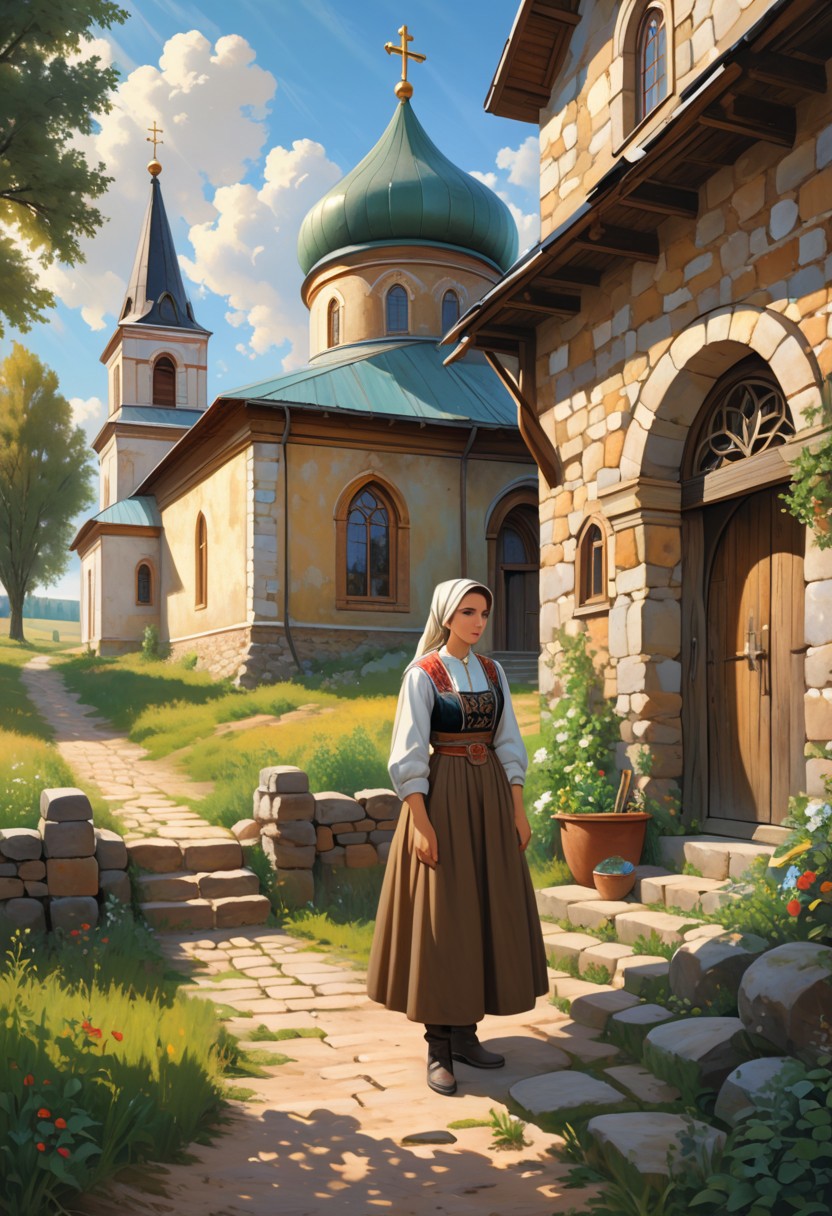 (masterpiece:1.5), (best quality), (8k resolution), highly detailed painting in the style of Abram Efimovich Arkhipov, a rustic village scene with a peasant woman standing in front of a stone church, dynamic brushstrokes, expressive and vibrant colors, sunlight filtering through clouds, rich earthy tones, fabric of the woman’s clothes painted with intricate texture, detailed architecture of the old church, slightly worn and weathered stones, soft lighting, dramatic shadows, historical realism, mood: nostalgic and intense, painterly texture, traditional Russian countryside, (Russian realism:1.3)