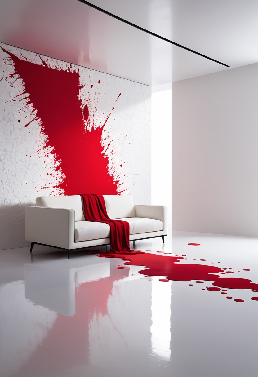 minimalist interior, white wall, large abstract red ink splatter as focal point, red ink splatter:1.3, dynamic texture, varying densities, texture:1.2, soft lighting illuminating white sofa below, soft lighting:1.0, modern minimalist design, modern:1.0, contrast between clean white walls and chaotic splatter, contrast:1.2, subtle shadowing on floor, shadow:0.8, neutral tones in room with bold red as only color accent, neutral:0.9, simple yet impactful composition, soft reflections from floor adding depth, reflections:0.8, splatter feels fluid organic, caught in motion, movement:1.1