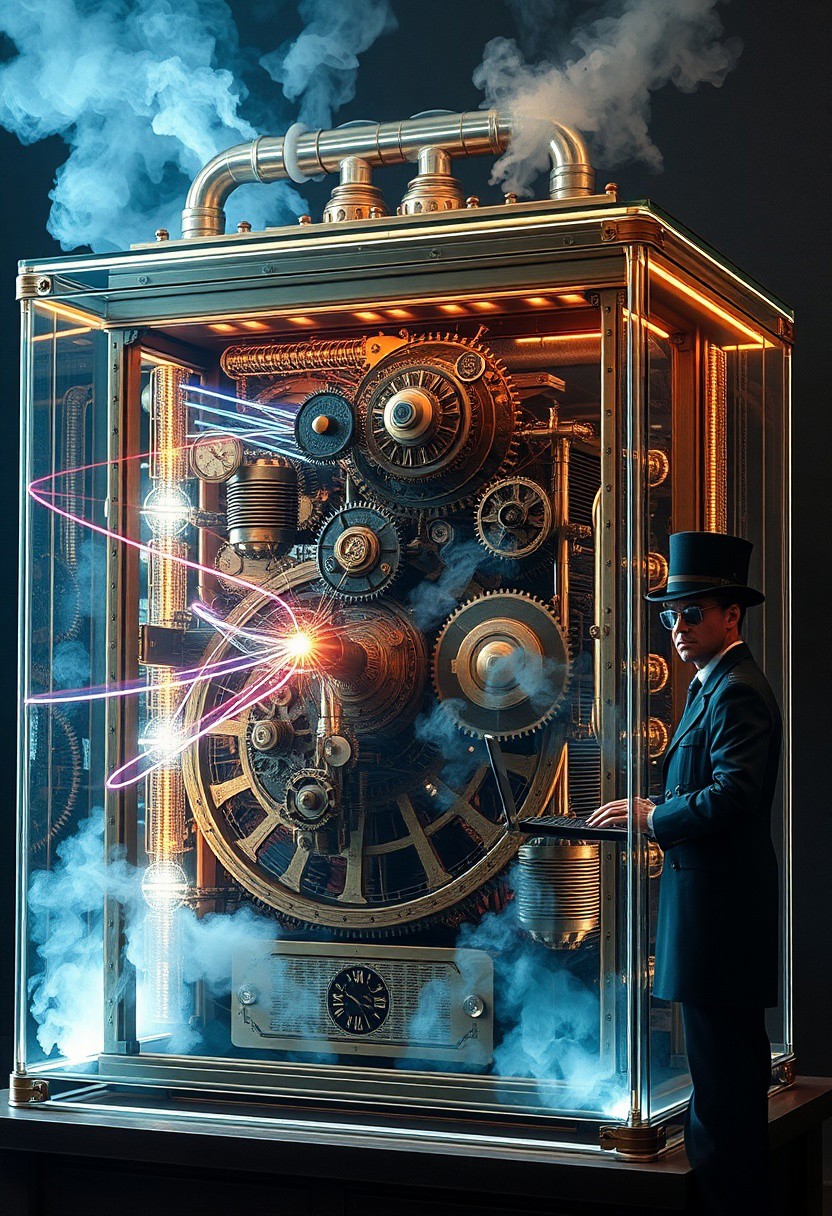 Inside of its glass case a fantastical steampunk quantum computer bends time and space. Beams of energy swirl and dance around the intricate clockwork gears and cog wheels. Steam issues from a bank of pipes along the top of the cabinet. Outside of the case a steampunk engineer, resplendent in his uniform wearing a top hat and goggles, stands at a keyboard to one side. This striking steampunk image, envisioned as a high resolution digital image, showcases the machine's ornate design and cutting-edge functionality. Every detail is meticulously rendered, creating a visually stunning masterpiece that captivates the viewer with its intricate beauty and technological brilliance.