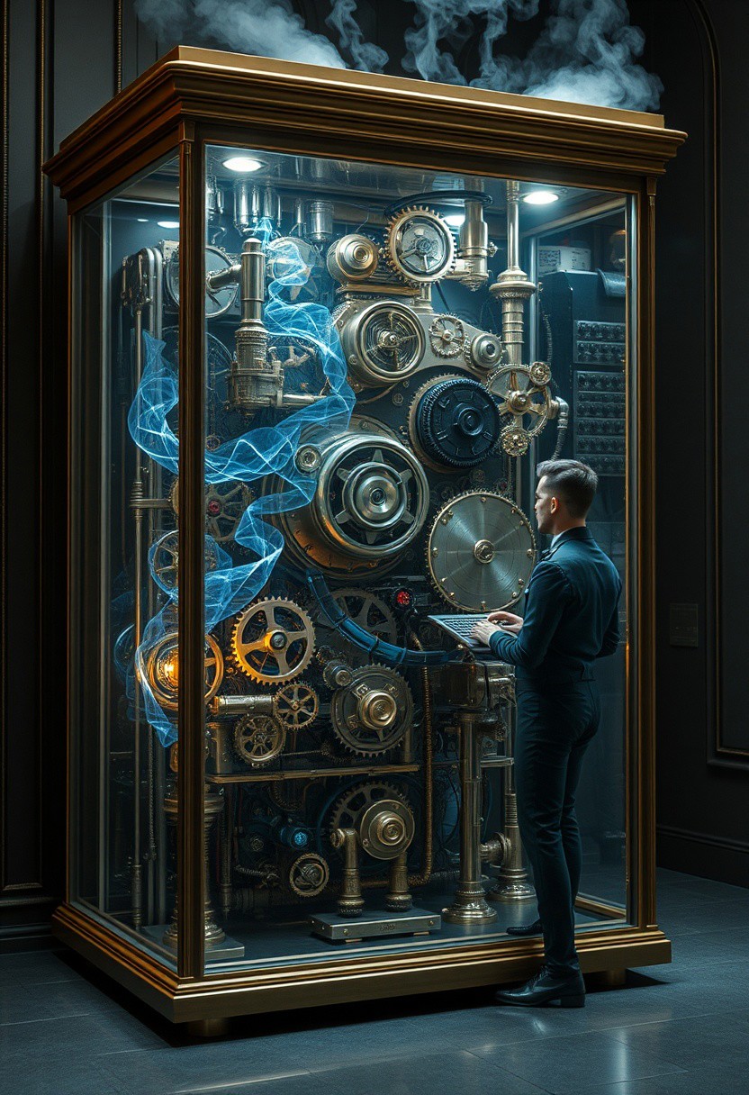 Inside of its glass case a fantastical steampunk quantum computer bends time and space. Beams of energy swirl and dance around the intricate clockwork gears and cog wheels. Steam issues from a bank of pipes along the top of the cabinet. Outside of the case a steampunk engineer, resplendent in his uniform, stands at a keyboard to one side. This striking steampunk image, envisioned as a high resolution digital image, showcases the machine's ornate design and cutting-edge functionality. Every detail is meticulously rendered, creating a visually stunning masterpiece that captivates the viewer with its intricate beauty and technological brilliance.