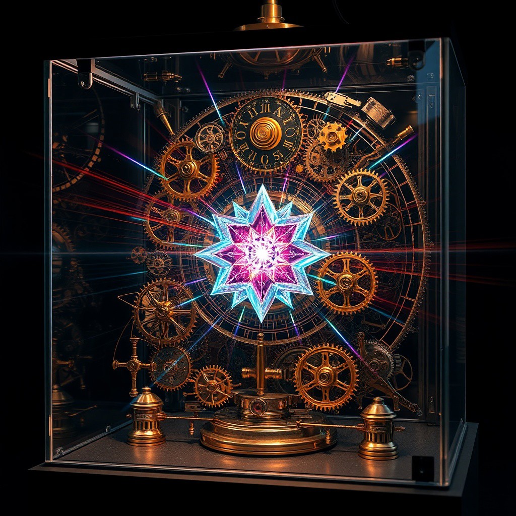 Inside of its glass case a fantastical steampunk quantum computer bends time and space. Beams of coloured photons swirl and dance around the intricate clockwork gears and cog wheels. At its hearts a fabulous multidimensional crystal pulses to to heartbeat of the universe. This striking image, envisioned as a high resolution digital image, showcases the machine's ornate design and cutting-edge functionality. Every detail is meticulously rendered, creating a visually stunning masterpiece that captivates the viewer with its intricate beauty and technological brilliance.