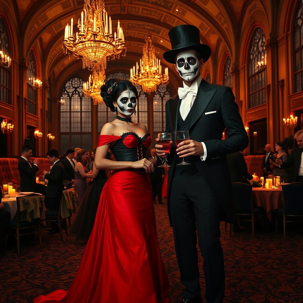 The man, dressed in a classic black suit with a white tie and white face paint in the style of a traditional Day of the Dead celebration, is holding a drink. His face paint includes a skull design, and he wears a black top hat. The woman, dressed in a striking, floor-length red gown with a black corset, has her hair styled in an elegant updo. She also wears black face paint, with a white skull design and a black choker. The background features an ornate ballroom with high, arched ceilings adorned with elaborate chandeliers casting a warm, golden glow. The walls are lined with tall, gothic windows, and the floor is covered in a rich, dark, patterned carpet. The room is filled with other guests, dressed in formal attire, engaged in conversations or dancing. Tables are set up with elegant tablecloths and candles, adding to the ambiance. The overall atmosphere is dark and mysterious, with a blend of elegance and macabre elements. The image combines elements of fantasy and historical fiction, creating a surreal, immersive scene.