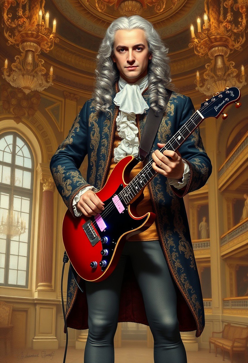 A male musician from the 18th century, resembling Johann Sebastian Bach, dressed in a richly embroidered coat with gold accents, a ruffled shirt, and knee-high stockings, with long, powdered gray curls cascading down to his shoulders. He is posed confidently with his hand resting on his hip, his face expressing calm determination. He is holding an electric guitar with neon accents (the colors contrasting his attire), standing in front of a grand Baroque music hall with ornate chandeliers. The style of the image resembles a Rococo oil painting, with detailed brushstrokes and warm tones.