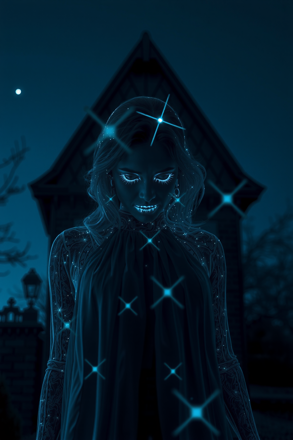 BREATHTAKING double exposure image featuring a translucent see-through apparition FORMED FROM DELICATE Grayish BLUE dark gray light sparkles taking the rough fuzzy form of a young woman with blond hair and with beautiful figure, at night, INSIDE an old Victorian haunted house late at night with DARK skies and shining stars, the woman's apparition silhouette is blended as a double exposure photograph, HYPER-MAXIMALIST, photorealism, cinematic horror, unreal engine, 8k, surreal rendition, EROTIC and MESMERIZING AND terrifying