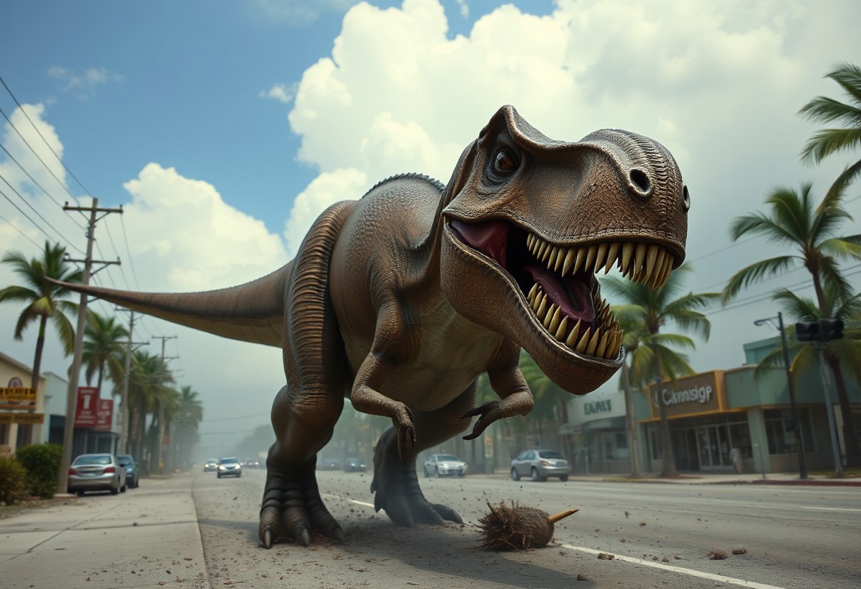 Photograph of a T-rex rampaging through the streets of florida, massacre, realistic, highly detailed