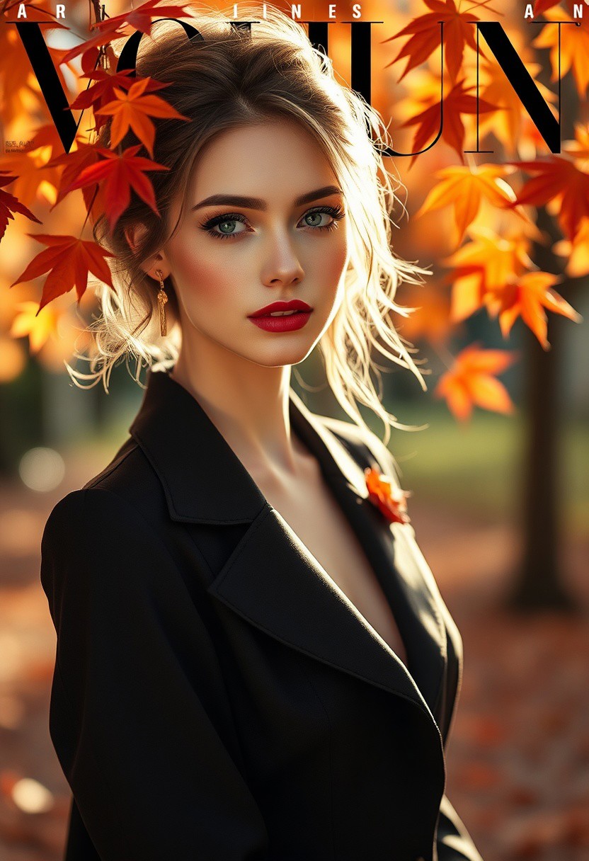 (fashion magazine cover:1.2),(full-size photograph:1.2),(a beautiful and delicate girl:1.1),(( look alike of Jessica Rabbit)),gorgeous formal attire,fashion design,a tender and watery gaze,elegant, ((Dadaism)),(creek:1.1),maple leaf,warm and delicate sunshine,falling maple leaves,