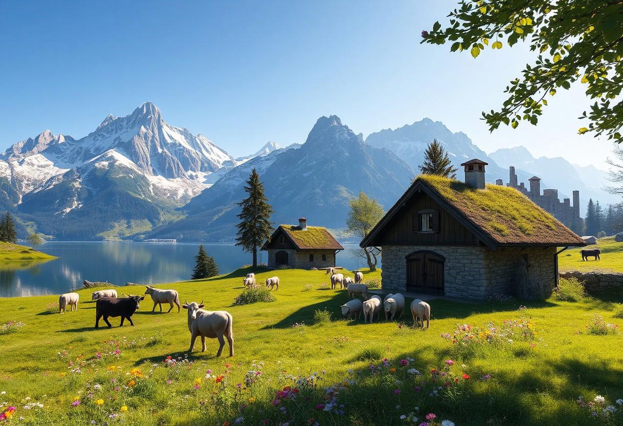 Ultra realism, high quality, high resolution 8K and above, stable and accurate focus, ultra correct anatomy, super detail. A beautiful mountain scene with tall snow-capped peaks reflected in a crystal clear lake. In the foreground are green meadows dotted with wild flowers of various colors. Included in the landscape are houses built of stone and wood, architecturally designed to blend in with nature. The roofs of the houses are covered with thick grass and colorful flowers. Cows roam the meadow, and a flock of sheep, led by shepherd dogs, graze around. The trees around the houses are tall and green, with leaves that cast shadows on the houses.(((The ruins of an ancient fortress can be seen in the distance, giving the scene historical depth))). The sunlight illuminates the landscape, creating a warm and welcoming atmosphere.