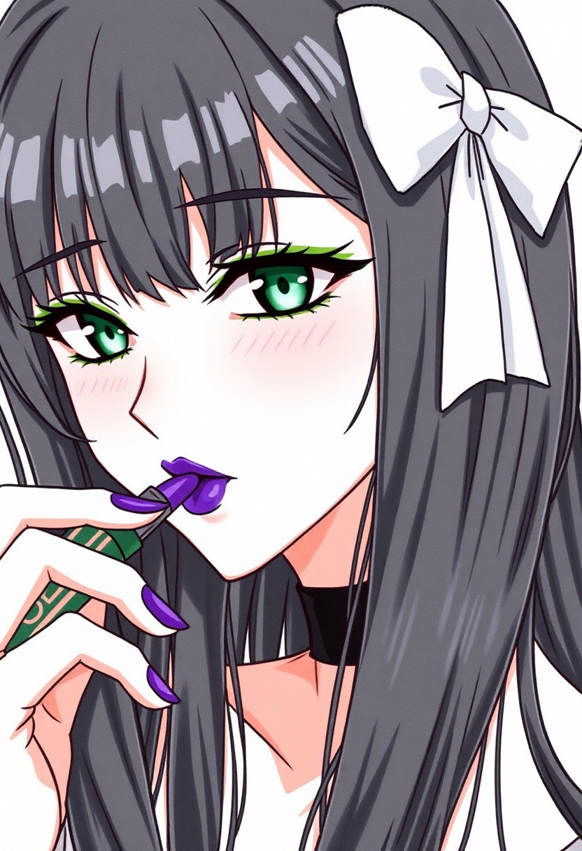 A female drawn in an anime style. She has long, black hair with a white ribbon ornament. She wears noticeable, thick green makeup around her eyes. Her eyes are a deep shade of green. Her eyes are blank and emotionless. She is wearing deep purple lipstick. She is applying purple lipstick to her lips from a glossy tube. Her fingernails are painted purple.