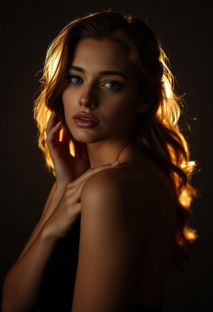 A 18-year-old, award-winning, hyperrealistic fashion model poses in a somber, cinematic mood, reminiscent of Vogue's finest moments. Inspired by the luxury of Louis Vuitton, she exudes elegance in a dark, moody setting. Her face, a picture of serenity, is bathed in subtle, warm light. Her natural beauty, accentuated by perfect curves, is the focal point of the image. Shot on a Phase One XF IQ4 150MP camera, the Schneider Kreuznach 80mm LS f/2.8 lens captures every detail with stunning clarity. The overall aesthetic is one of refined sophistication, with a hint of nostalgia, as if the photograph has been slightly faded, like a treasured, vintage print. The model's dynamic pose, reminiscent of Marianna Rothen's style, draws the viewer's eye, while the grainy texture adds a tactile quality to the image. This is a true masterpiece of fashion photography, a work of art that transcends the boundaries of mere mortal images.