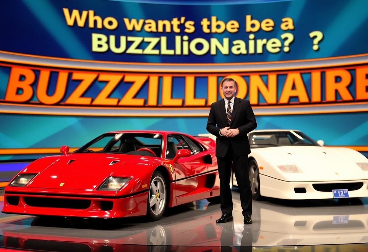 Game show scene. The title of the show is "Who wants to be a Buzzillionaire". Game show host is in the middle of the scene. Next to him is a Ferrari F40.