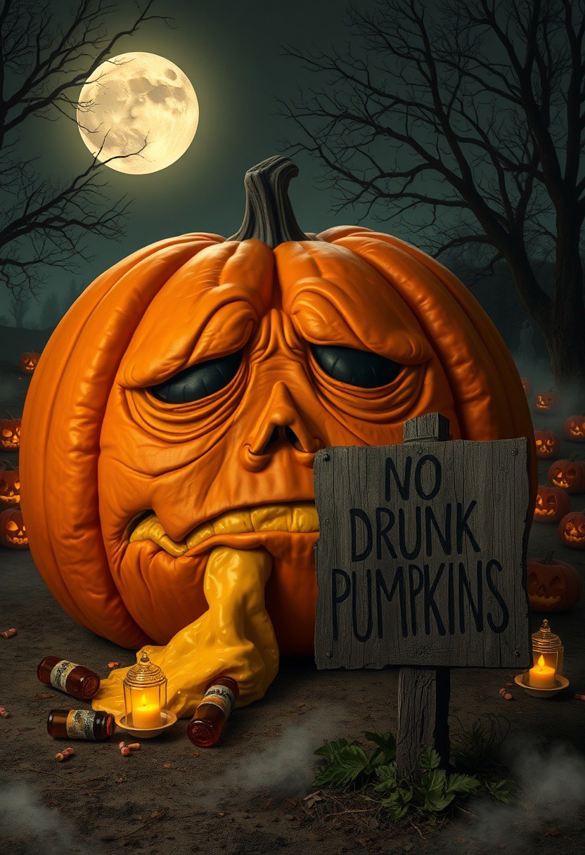 “Enormous orange pumpkin with a tired, worn-out expression, sitting on the ground as it vomits its own pumpkin guts. Empty beer bottles scattered around, as if it just had a long night of drinking. Surrounding the pumpkin are spooky Halloween elements: glowing jack-o’-lanterns, eerie fog creeping along the ground, flickering candles inside skull-shaped lanterns, and a few scattered candy wrappers. A full moon casts a dim light over the scene, with creepy shadows from nearby trees and faint ghostly figures in the distance. In front of the pumpkin, a decayed, broken wooden sign stands with deep engravings that read ‘NO DRUNK PUMPKINS,’ adding a darkly humorous touch to the eerie atmosphere.”