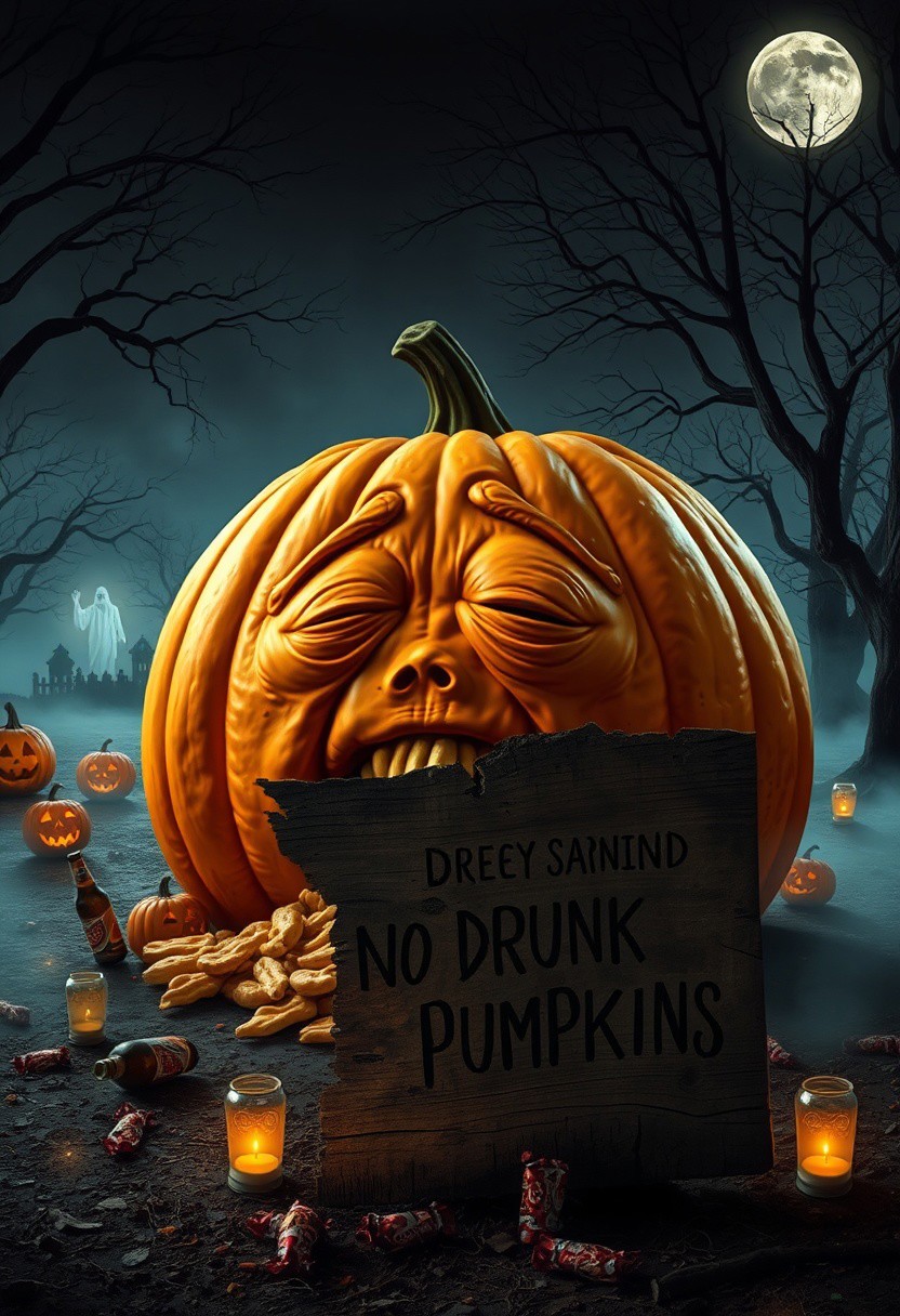 “Enormous orange pumpkin with a tired, worn-out expression, sitting on the ground as it vomits its own pumpkin guts. Empty beer bottles scattered around, as if it just had a long night of drinking. Surrounding the pumpkin are spooky Halloween elements: glowing jack-o’-lanterns, eerie fog creeping along the ground, flickering candles inside skull-shaped lanterns, and a few scattered candy wrappers. A full moon casts a dim light over the scene, with creepy shadows from nearby trees and faint ghostly figures in the distance. In front of the pumpkin, a decayed, broken wooden sign stands with deep engravings that read ‘NO DRUNK PUMPKINS,’ adding a darkly humorous touch to the eerie atmosphere.”
