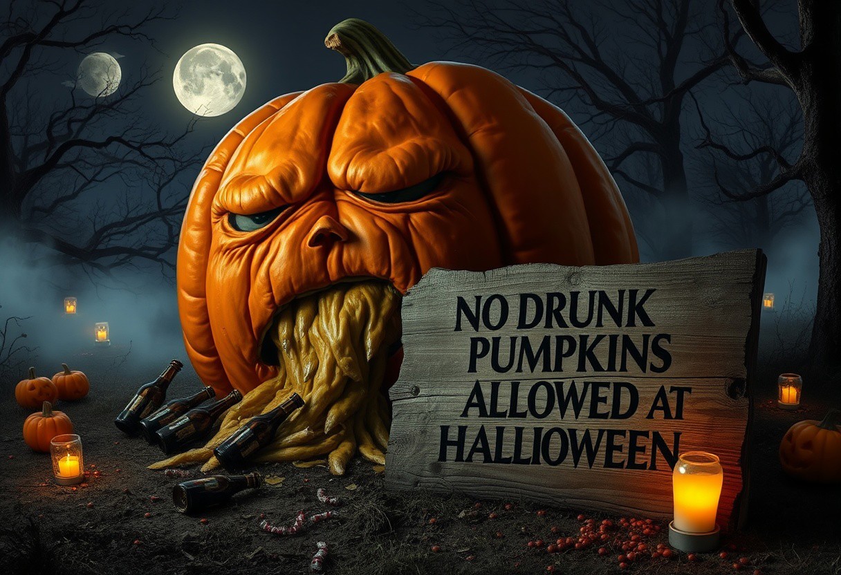 “Enormous orange pumpkin with a tired, worn-out expression, sitting on the ground as it vomits its own pumpkin guts. Empty beer bottles scattered around, as if it just had a long night of drinking. Surrounding the pumpkin are spooky Halloween elements: glowing jack-o’-lanterns, eerie fog creeping along the ground, flickering candles inside skull-shaped lanterns, and a few scattered candy wrappers. A full moon casts a dim light over the scene, with creepy shadows from nearby trees and faint ghostly figures in the distance. In front of the pumpkin, a decayed, broken wooden sign with deep engravings reads ‘NO DRUNK PUMPKINS ALLOWED AT HALLOWEEN,’ adding a darkly humorous touch to the eerie atmosphere.”