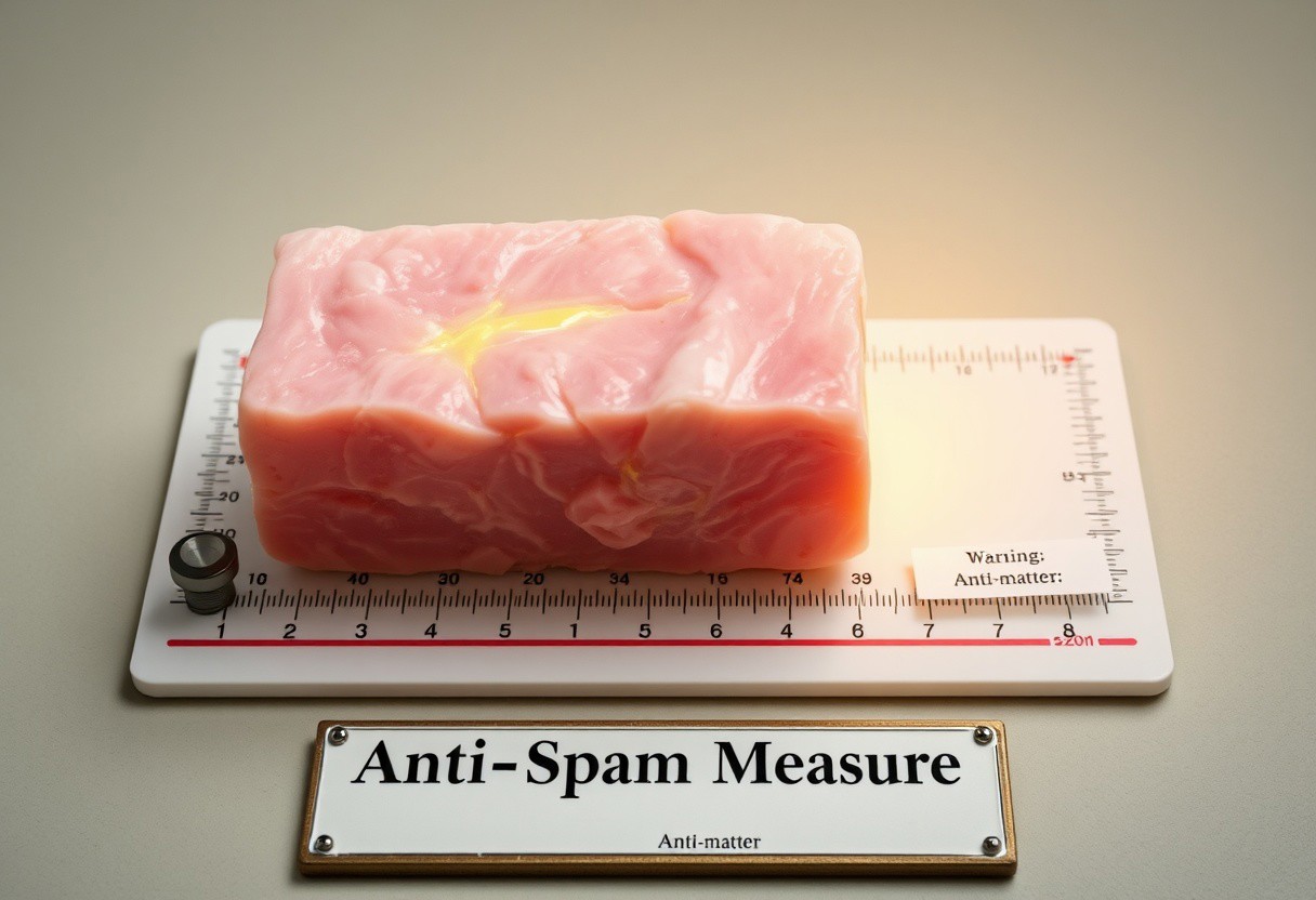 A high quality photograph with an art deco frame and title plaque at the bottom of "Anti-Spam Measures" picturing a block of pink flesh with a glowing yellow aura on a measuring board. There's a small warning label next to the pink block stating "Warning: Anti-matter".