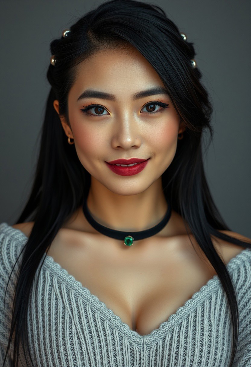 A photo image of a beautiful young Chinese woman in her late twenties. She has long black side cut hair, with multiple silver hair ornaments. She has smoky eyeliner and eye shadow, with black lipstick. She has a slim jawline and pouty lips, which are curled up in a slight smile. She is wearing an oversized sweater, with bare shoulders, and the sweater is low enough to reveal her ample breasts and perky nipples. She has on a black choker adorned with three emeralds on it.