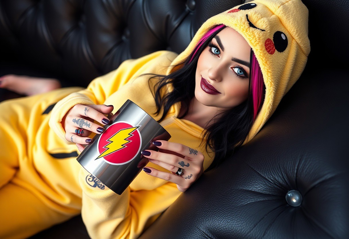 A high-definition photo of a beautiful 20yo goth girl, wearing Pikachu onesie, holding coffee mug. She is laying on a black leather couch, in a seductive relaxed pose, barefoot, smiling. The girl has black hair with pink and purple highlights, framing her beautiful face. Her stunning blue eyes are accentuated by her black eyeshadow. Her lipstick is black and metallic purple. She has visible, vivid, intricate tattoos. The large steel mug bares a yellow lightning bolt logo with 'Buzz Queen' in large letters. 8k detail, full body