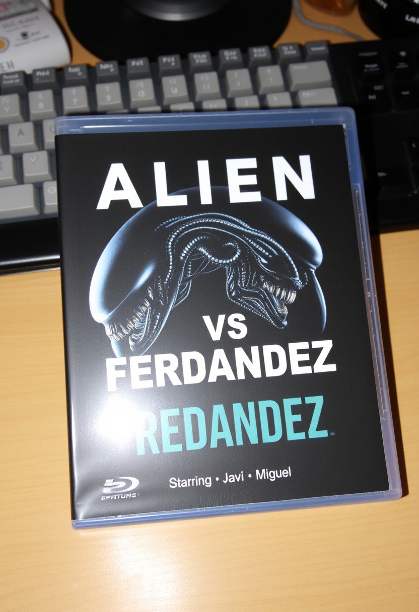 This is a photograph of DVD case with a desk background. The case features an alien and a xenomorph as in alien vs predator movie and a prominent black bold text "Alien VS Fernandez", Below is a bullet list of features: "Starring", "Javi" and "Miguel".