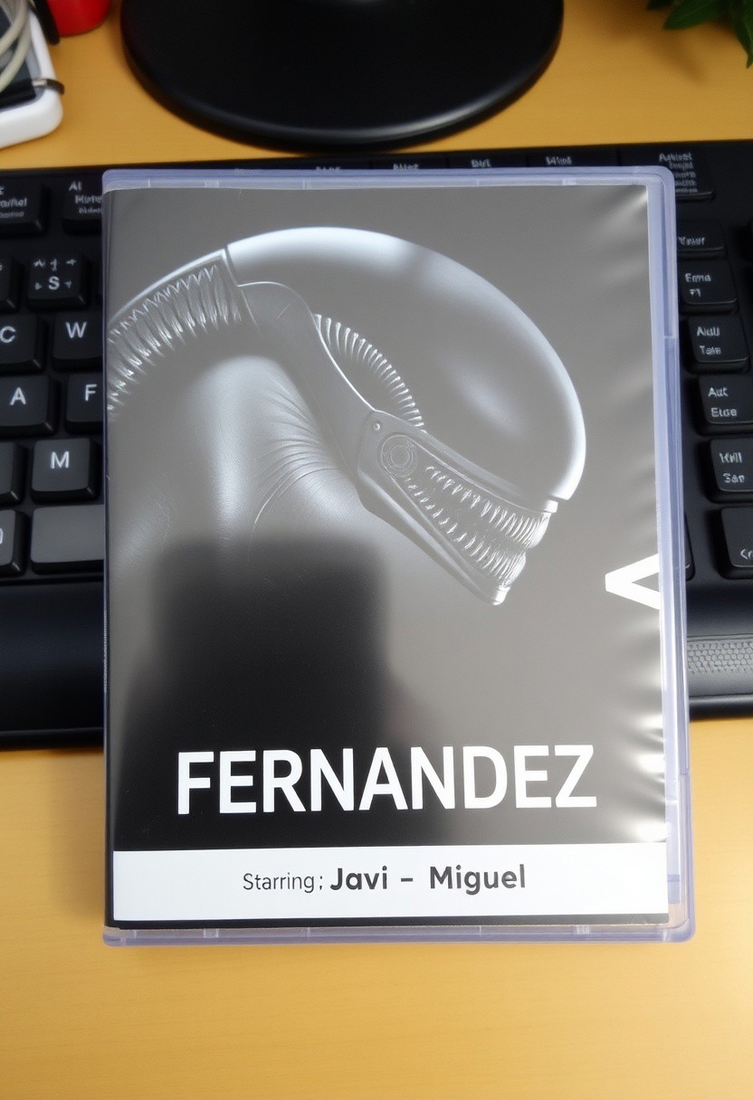 This is a photograph of DVD case with a desk background. The case features an alien and a xenomorph as in alien vs predator movie and a prominent black bold text "Alien VS Fernandez", Below is a bullet list of features: "Starring", "Javi" and "Miguel".