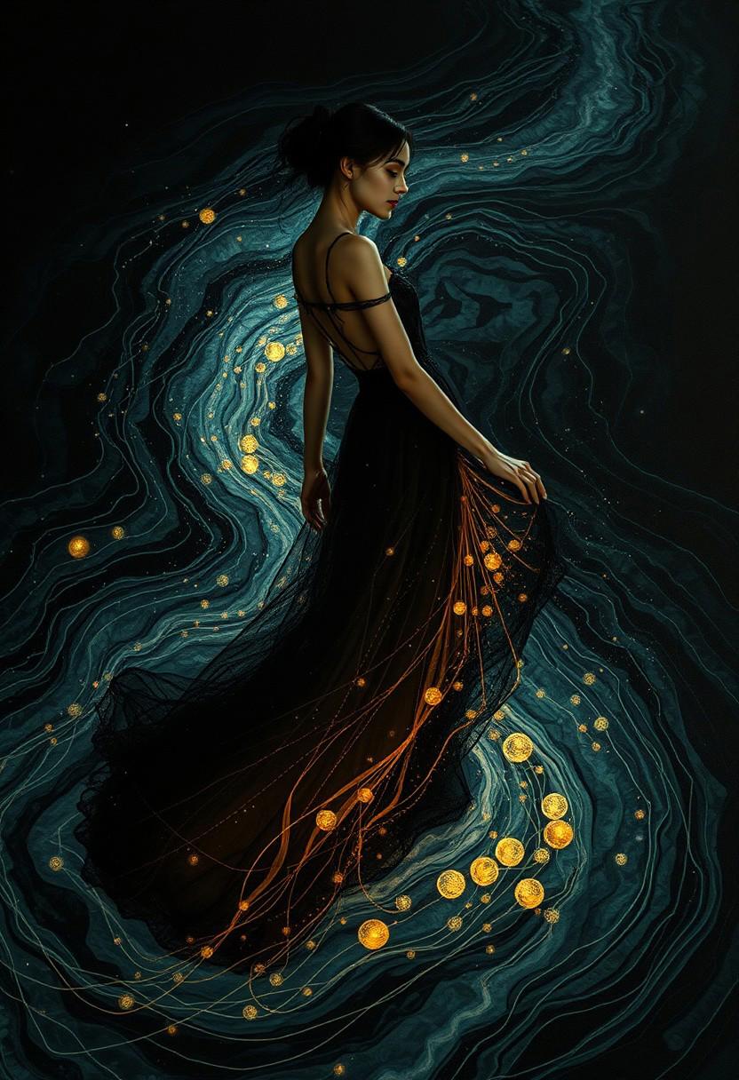 (Soft Lighting Photography by Mimoza Veliu and Mario Giacomelli:1.2), romanticism art by Jean-Leon Gerome and Conrad Roset, Painting, singularity black rivers ripple their banks in the depth-spanning evocative form of this stunning and whimsical creation: one with an intelligent figure who radiates passion and intelligence. The dress accentuate her impressionist physique to decipher what she wants out. She moves confidently across all shapes and sizes crafted from high fiber, carrying through a swirly energy network in which they are filled with complex parts. It is both terrifying for viewers and captivating melancholic., luxurious sharp focus, intense, dynamic cinematic color, intricate detail, Fashion and art, elegant and sophisticated, innovative use of light and shadow,