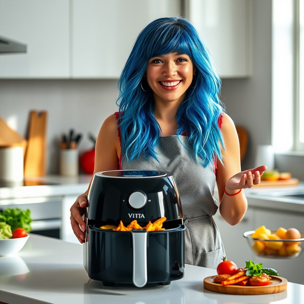 epic cinematic photography of a 23 young woman with a Long shaggy style vibrant blue hair stands in a bright, modern kitchen, enthusiastically showcasing a sleek air fryer. She’s wearing a stylish apron, and the countertop is filled with colorful vegetables and healthy snacks. With a warm smile, she explains the benefits of cooking with an air fryer, demonstrating how easy it is to prepare crispy fries and roasted veggies. The sunlight streams in through the window, highlighting her energetic personality as she invites viewers to join her on a journey to healthier cooking,on the handle of the air fryer it has the company branding that says (Vitta)"