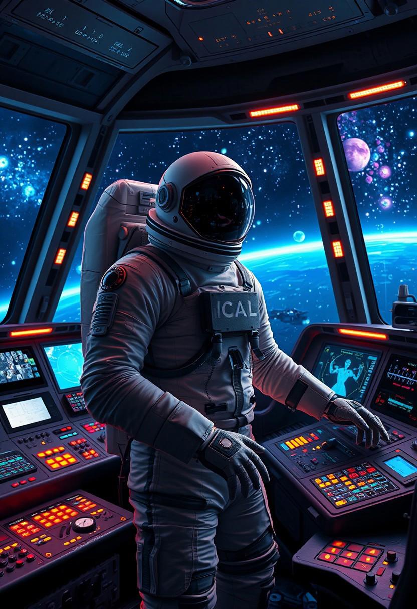 Ultra realism, high quality, high resolution 8K and above, stable and accurate focus, ultra correct anatomy, super detail. An astronaut without a spacesuit, dressed in a high-tech work uniform, controls a spacecraft in the ship's command center. The large windows of the command center reveal a majestic view of deep space, illuminated by distant stars and galaxies. The astronaut is surrounded by consoles and panels with numerous light indicators and displays showing mission data. The astronaut's hands are placed on the control sticks and buttons on the console. Other parts of the spacecraft and technical equipment can be seen in the background. Colors: High tech uniform in neutral colors, metallic gray for the ship, bright blue and purple for the galaxies and stars. Objects: Astronaut, command center, control panels, indicator lights, displays, spaceship, distant galaxies and stars. Atmosphere: High-tech, futuristic, majestic. Styles: Realistic, Sci-Fi. Additional elements: Lighting effects, detailed textures, space dust and particles.