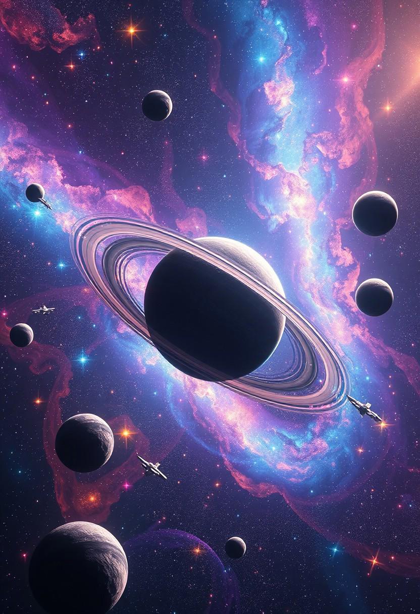 Ultra realism, high quality, high resolution 8K and above, stable and accurate focus, ultra correct anatomy, super detail. A cosmic landscape of brightly lit galaxies and nebulae studded with stars that sparkle like diamonds. In the center of the image, a huge planet with rings that stretch wide into space. Numerous planets with different colors and textures are visible in the sky, creating a fascinating and exotic atmosphere. Spaceships pass through the scene, leaving trails of light in their wake. Light from distant stars illuminates the scene, lending a sense of depth and mystery. Colors: Bright, vibrant colors like blue, purple, orange and green. Objects: Galaxies, nebulae, stars, planets, rings around planets, spaceships. Atmosphere: Majestic, mystical, captivating. Styles: Realistic, Sci-Fi. Additional elements: Light effects, comets, asteroids, distant light rays, galactic spirals.