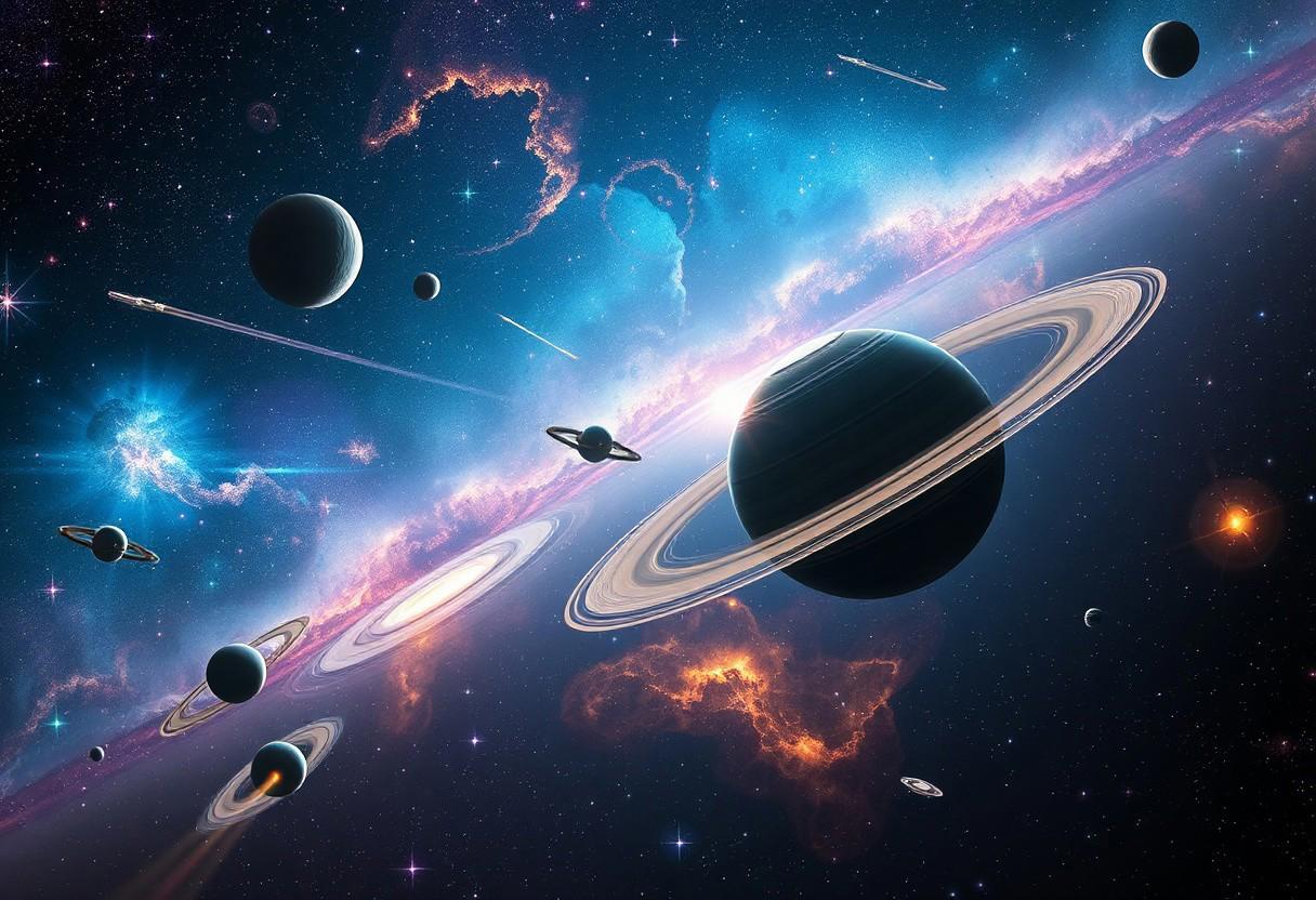 Ultra realism, high quality, high resolution 8K and above, stable and accurate focus, ultra correct anatomy, super detail. A cosmic landscape of brightly lit galaxies and nebulae studded with stars that sparkle like diamonds. In the center of the image, a huge planet with rings that stretch wide into space. Numerous planets with different colors and textures are visible in the sky, creating a fascinating and exotic atmosphere. Spaceships pass through the scene, leaving trails of light in their wake. Light from distant stars illuminates the scene, lending a sense of depth and mystery. Colors: Bright, vibrant colors like blue, purple, orange and green. Objects: Galaxies, nebulae, stars, planets, rings around planets, spaceships. Atmosphere: Majestic, mystical, captivating. Styles: Realistic, Sci-Fi. Additional elements: Light effects, comets, asteroids, distant light rays, galactic spirals.