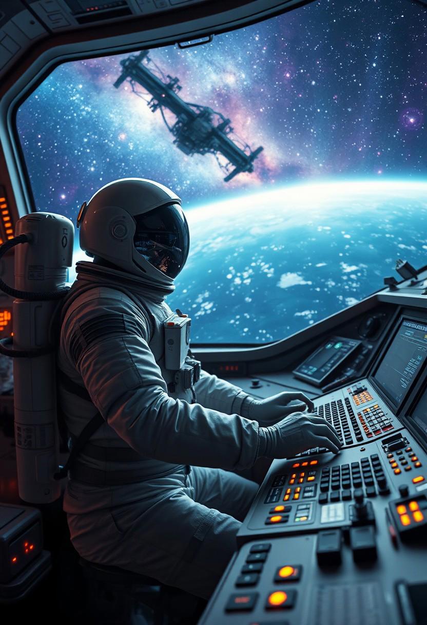 Ultra realism, high quality, high resolution 8K and above, stable and accurate focus, ultra correct anatomy, super detail. An astronaut without a spacesuit, dressed in a high-tech work uniform, controls a spacecraft in the ship's command center. The large windows of the command center reveal a majestic view of deep space, illuminated by distant stars and galaxies. The astronaut is surrounded by consoles and panels with numerous light indicators and displays showing mission data. The astronaut's hands are placed on the control sticks and buttons on the console. Other parts of the spacecraft and technical equipment can be seen in the background. Colors: High tech uniform in neutral colors, metallic gray for the ship, bright blue and purple for the galaxies and stars. Objects: Astronaut, command center, control panels, indicator lights, displays, spaceship, distant galaxies and stars. Atmosphere: High-tech, futuristic, majestic. Styles: Realistic, Sci-Fi. Additional elements: Lighting effects, detailed textures, space dust and particles.