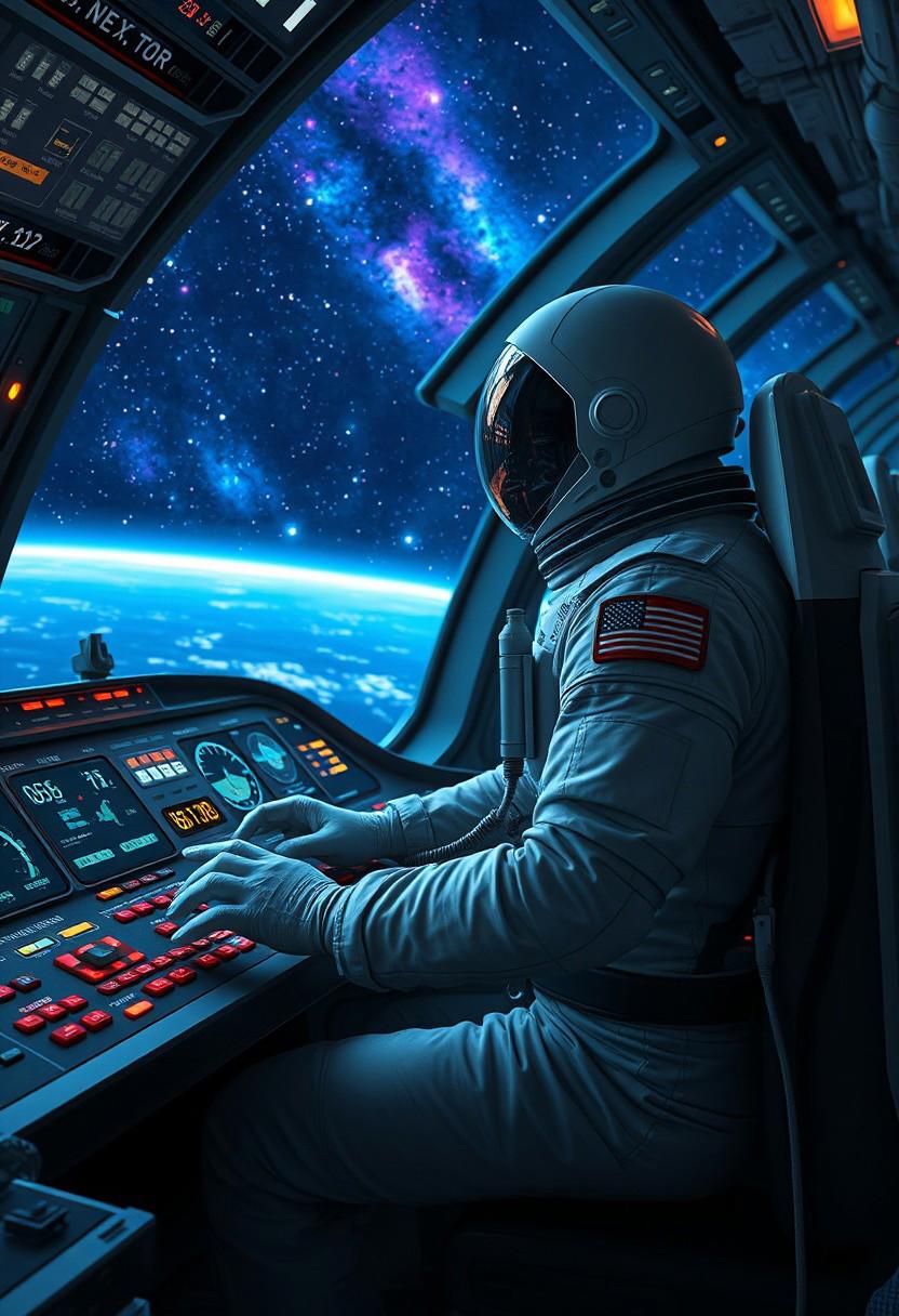 Ultra realism, high quality, high resolution 8K and above, stable and accurate focus, ultra correct anatomy, super detail. An astronaut without a spacesuit, dressed in a high-tech work uniform, controls a spacecraft in the ship's command center. The large windows of the command center reveal a majestic view of deep space, illuminated by distant stars and galaxies. The astronaut is surrounded by consoles and panels with numerous light indicators and displays showing mission data. The astronaut's hands are placed on the control sticks and buttons on the console. Other parts of the spacecraft and technical equipment can be seen in the background. Colors: High tech uniform in neutral colors, metallic gray for the ship, bright blue and purple for the galaxies and stars. Objects: Astronaut, command center, control panels, indicator lights, displays, spaceship, distant galaxies and stars. Atmosphere: High-tech, futuristic, majestic. Styles: Realistic, Sci-Fi. Additional elements: Lighting effects, detailed textures, space dust and particles.