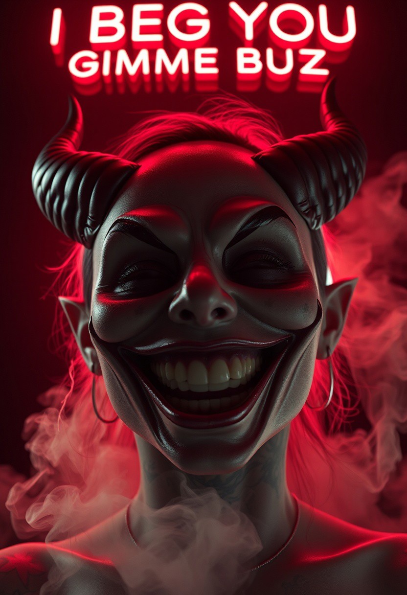 “A hyper-realistic, 3-dimensional close-up of a woman wearing a highrise mask featuring an exaggerated, wide, ecstatic smile, with devilish horns subtly curving from the sides. The mask, devoid of a nose or eyes, pops off the screen with its lifelike texture and unsettling, manic joy. Tattooed stars wrap around her face, giving a surreal, layered depth to the design. Shot with Panavision aspherical lenses at 40mm, the scene is bathed in cinematic studio lighting, emphasizing every contour. A soft red, low diffuse light glows from behind, enhancing the three-dimensionality, while light greenish fog and white smoke twist around her in dynamic layers against a pitch-black background. Above the figure, glowing neon letters spell out ‘I BEG YOU – GIMME BUZ,’ floating in space, adding a rebellious and chaotic energy to the surreal, immersive atmosphere.”