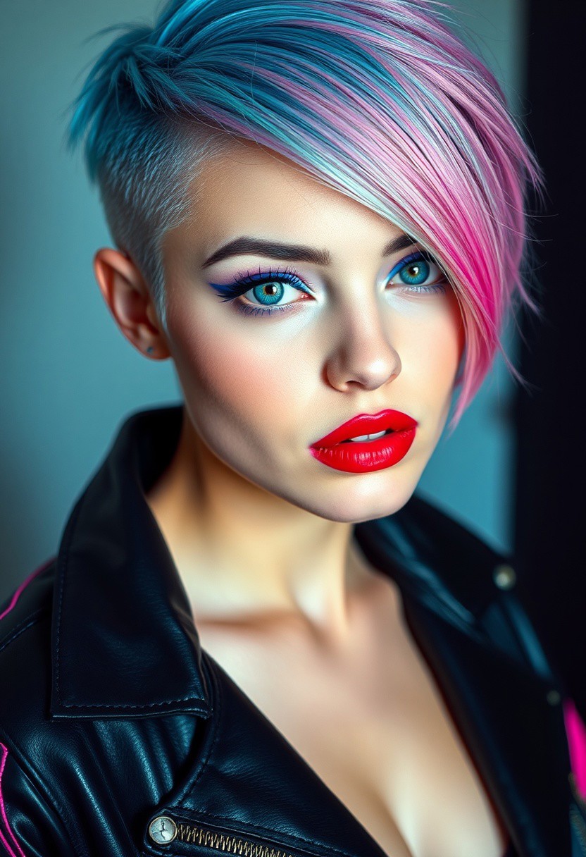 a gorgeous 25 years old caucasian woman, pale skin, cyan short hair in asymmetrical cut with shaved right side and pink longer bang on the left side, long blue eyelashes, blue mascara, purple eyeliner define her big beautiful grey eyes, green eyeshadow, luscious sensual red glossy lips, rouge, sexy curves, sexy feminine black leather jacket with neon pink and cyan lines, looking at viewer dominantly,