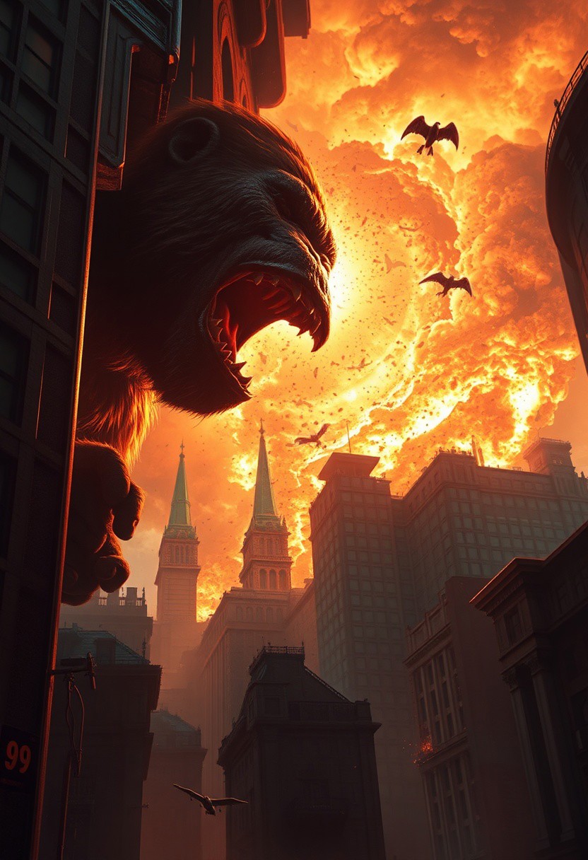 score_9, score_8_up, score_7_up, Ultra detailed digital art masterpiece, immense details, Photorealistic, By simon bisley, earl norem, rampage Gigantic dark gorilla rage smashing buildings in a city, Barbarism, grotesquery, darkly comedic, greebles, Sfumato, jugenstil, photoreal, photographic, concept art, cinematic lighting, cinematic composition, rule of thirds, mysterious, eerie, cinematic lighting, ultra-detailed, ultrarealistic, photorealism, 16k, octane render, sf, cinematic, digital art, colorful, wlop, artgerm and james jean, ultra hd, realistic, vivid colors, highly detailed, UHD drawing, perfect composition, beautiful detailed intricate insanely detailed, rays, vivid colors reflects, luminism,