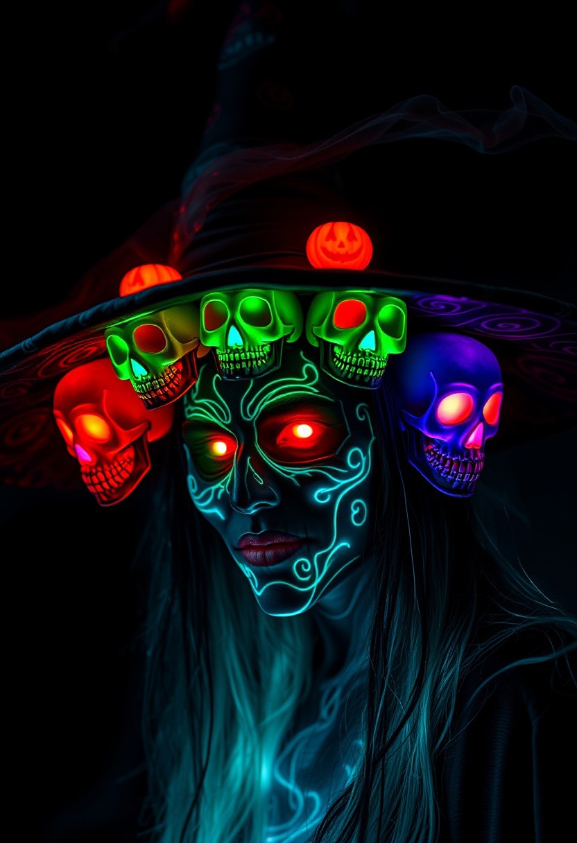 A hyper-realistic, intricately detailed image of a witch wearing a traditional, pointy hat adorned with a row of glowing, Halloween skulls, each with a different colored, painted face: red, green, blue, and purple. The skulls seem to leer and grimace, their glowing faces casting an eerie, otherworldly glow. The witch's face is painted with glow-in-the-dark, swirling patterns that seem to shift and writhe in the dark, adding to the overall sense of mysticism and menace. The hat itself is a deep, rich black, with intricate, swirling patterns that seem to dance in the light. The surrounding environment is a deep, inky black, punctuated only by the glowing, ethereal border that surrounds the image, casting an eerie, mystical glow over the entire scene. highest-Quality, intricate details, visually stunning, Masterpiece