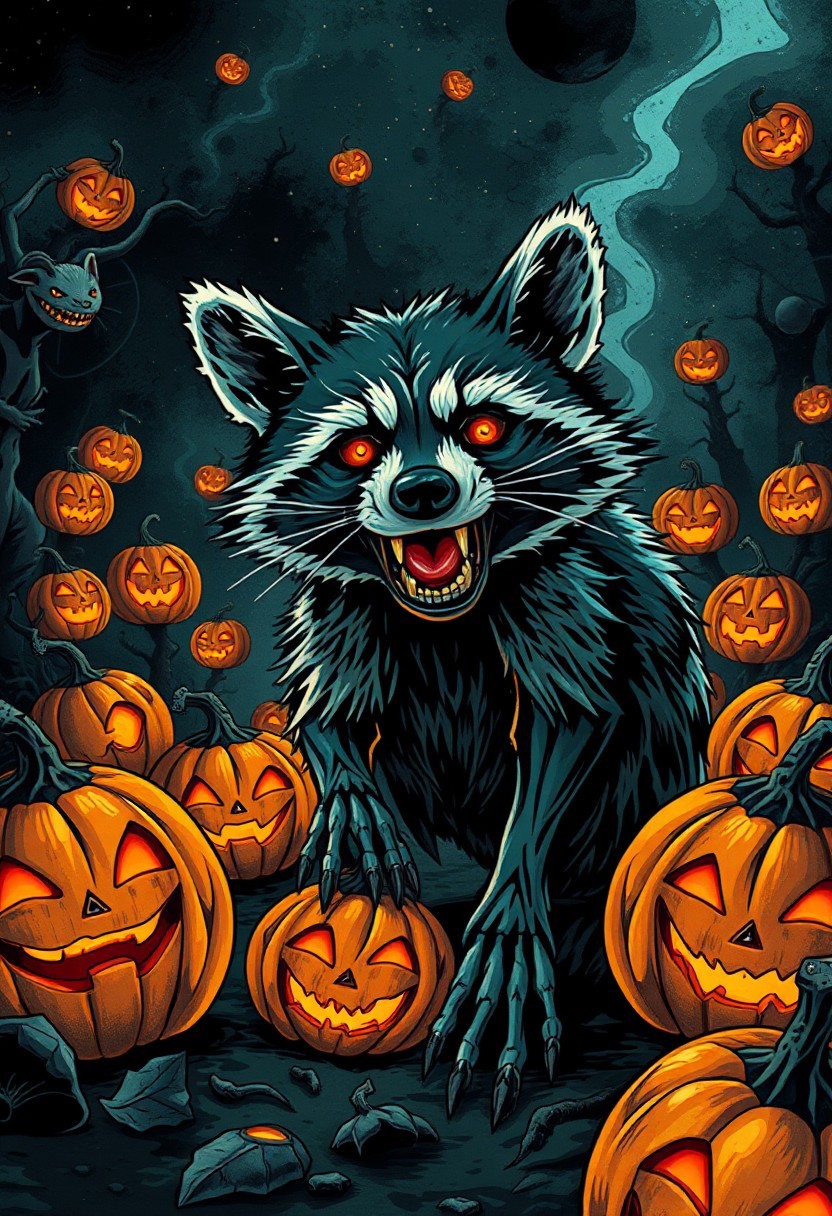 chaotic composition, non-euclidean geometry, an undead raccoon with a grin, it is halloween, jack-o-lanterns, mysterious eerie pumpkins in infinite spacetime, disoriented, a mixture of realism and illustration, high contrast, masterpiece, cinematic color graded, bright and dark