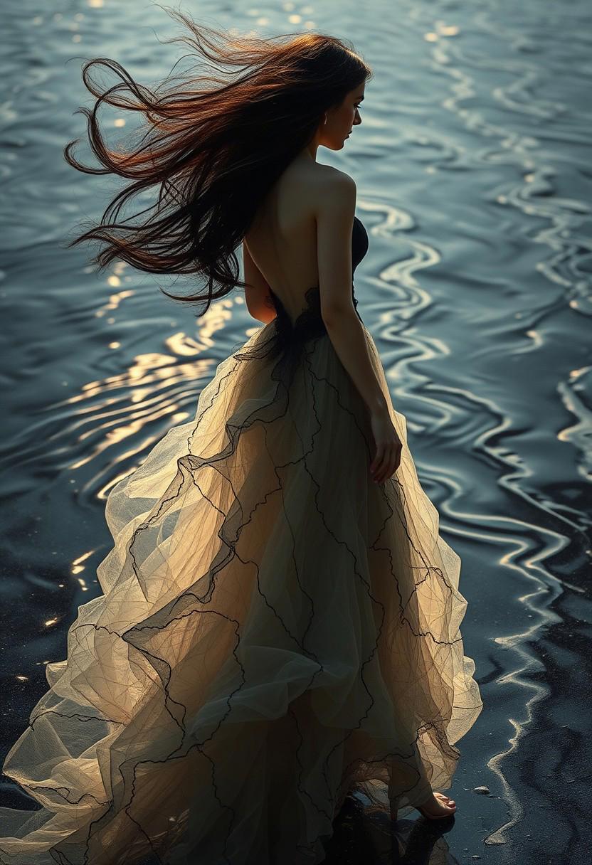 (Soft Lighting Photography by Mimoza Veliu and Mario Giacomelli:1.2), romanticism art by Jean-Leon Gerome and Conrad Roset, Painting, singularity black rivers ripple their banks in the depth-spanning evocative form of this stunning and whimsical creation: one with an intelligent figure who radiates passion and intelligence. The dress accentuate her impressionist physique to decipher what she wants out. She moves confidently across all shapes and sizes crafted from high fiber, carrying through a swirly energy network in which they are filled with complex parts. It is both terrifying for viewers and captivating melancholic., luxurious sharp focus, intense, dynamic cinematic color, intricate detail, Fashion and art, elegant and sophisticated, innovative use of light and shadow,