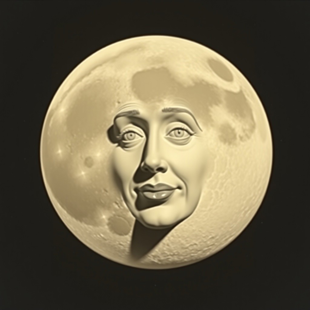3d full Moon with woman's face sculpted on it large craters, caricature, small stars in background, unrealistic, still from 1940s movie