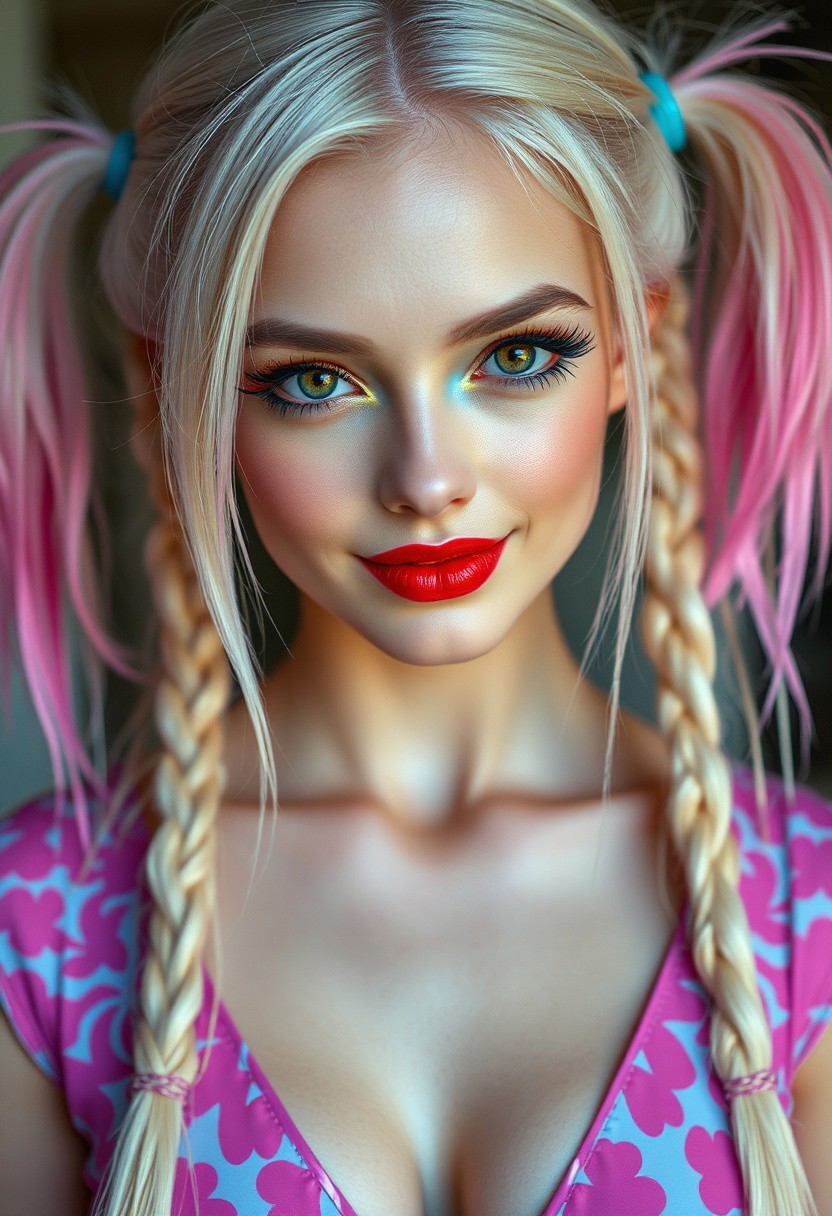 a gorgeous 20 years old caucasian woman, very pale skin, platinum blond very long hair in unkempt long pigtails on her each head's sides with the right pigtail in cyan color and the left pigtail in pink color, long red eyelashes on her left eye and long blue eyelashes on her right eye, blue mascara on her right eye and red mascara on her left eye, purple eyeliner define her big beautiful amber eyes, green eyeshadow on her right eyelid and orange eyeshadow on her left eyelid, luscious sensual red glossy lips in sexy smear, rouge, sexy curves, big breastsm sexy feminine latex dress with cleavage in cyan-pink pattern, looking at viewer naughty and playfully, seductive smile