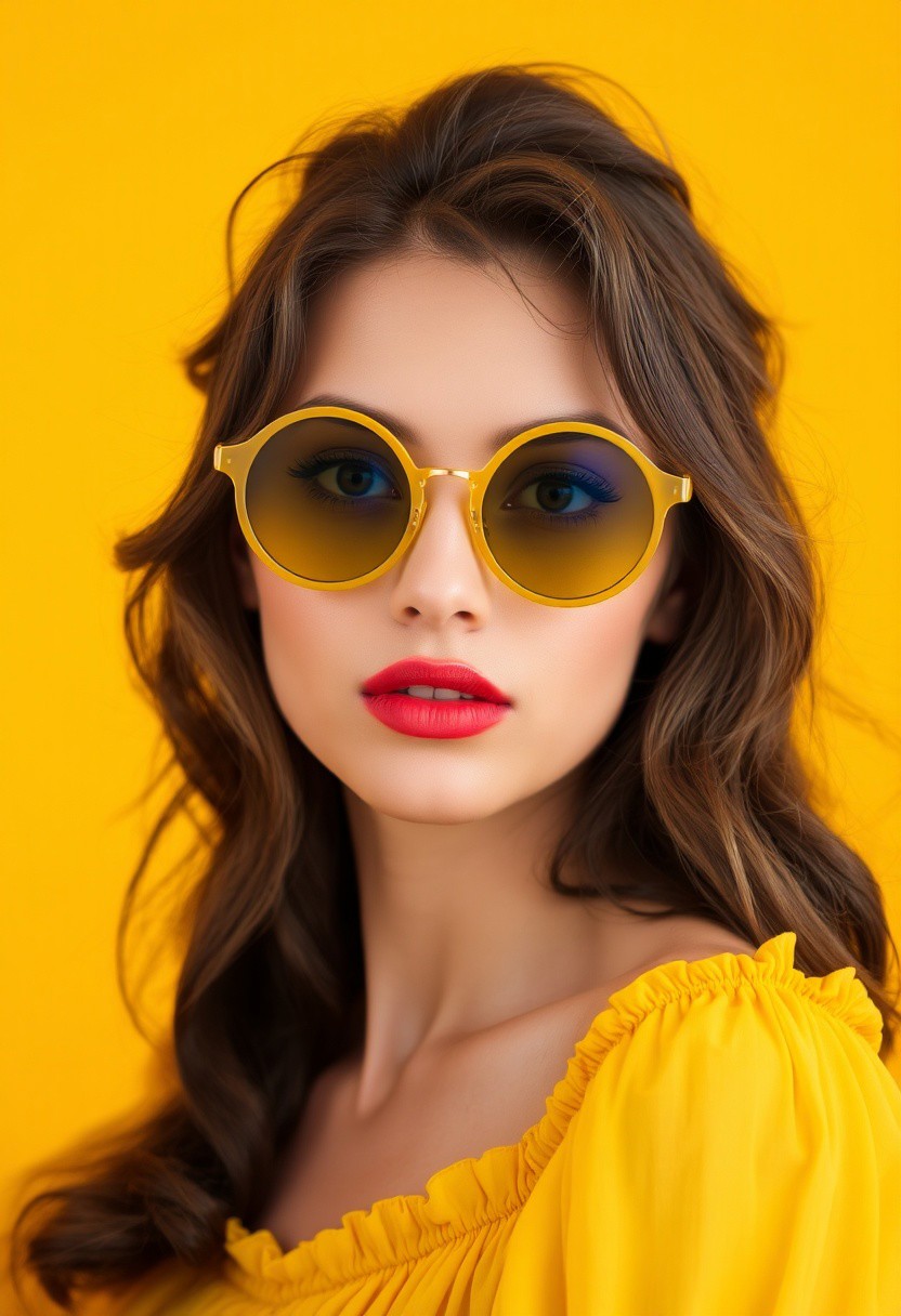 Close-up of a woman with dark brown, wavy hair and round, yellow sunglasses. The woman is positioned against a solid yellow background. Her face and upper torso are the central focus. Her skin appears smooth and light-toned. She has a soft, slightly lifted expression, and her lips are painted with a vibrant, coral-toned lipstick. Her eyes are visible beneath the sunglasses. The sunglasses are round and yellow, with gold-toned rims and a noticeable frame. The woman is wearing a loose, yellow, off-the-shoulder top with a ruffled or pleated design. The fabric looks like a type of soft, flowing silk or chiffon. The fabric texture is visible; the pleats and folds are apparent. The lighting highlights the woman's features and creates a warm, slightly soft glow. The yellow background contrasts sharply with her skin and clothing, emphasizing her appearance. The image's overall aesthetic is fashion-oriented, possibly for a magazine or social media. <lora:FLUX-daubrez-DB4RZ-v2:1> DB4RZ, DB4RZ style painting