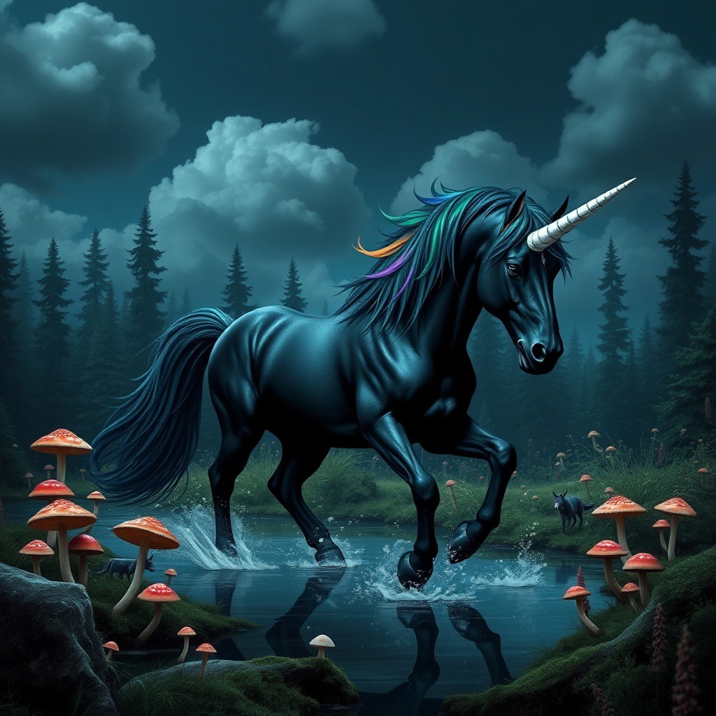 the muscular black heavy horse style unicorn trudging through an enchanted forest, its pearlescent horn glistening with the blood of its victims, and the rainbow mane flowing gently in the breeze. water shows unicorn reflections, The poisonous mushrooms surround it, and tiny clouds of sparkling dust puff up with each step. The sky is a dark blue with fluffy grey clouds, while curious woodland creatures watch in fear from the dark of the forest. The whole atmosphere feels magical and full of horror, perfectly capturing a grim moment. Clydesdale, draft-horse, drought horse, Buffhorse <lora:Ultima_Flux_v1:0.4>