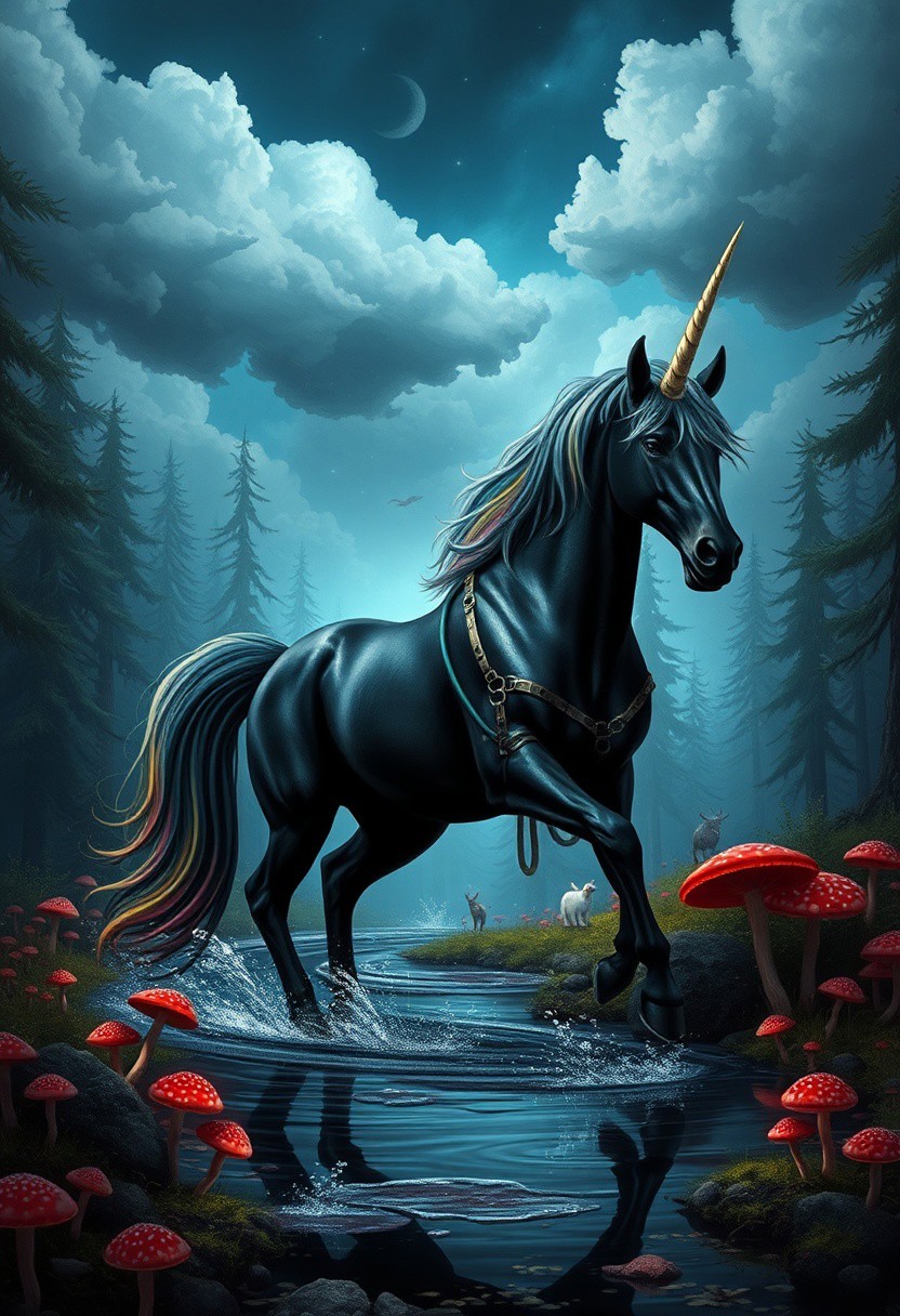 the muscular black Draft horse style unicorn prancing through an enchanted forest, its pearlescent horn glistening in the blood of its victim, and the rainbow mane flowing gently in the breeze. water shows unicorn reflections, The poisonous mushrooms surround it, and tiny clouds of sparkling dust puff up with each step. The sky is a dark blue with fluffy grey clouds, while curious woodland creatures watch in fear from the dark of the forest. The whole atmosphere feels magical and full of horror, perfectly capturing a grim moment.<lora:Ultima_Flux_v1:0.4>