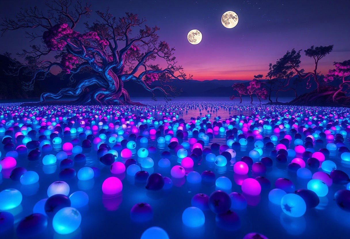 An otherworldly lake completely transformed into a sea of luminous, glowing berries, each one emitting a soft, magical light. The berries—ranging from vivid neon blues, radiant pinks, and deep purples—float like stars on the lake's surface, creating an ethereal, glowing mosaic. The water beneath shimmers with a bioluminescent glow, as though the lake itself is alive. In the background, surreal trees with twisting, glowing vines and oversized leaves stretch toward a twilight sky, where two moons hang low, casting an otherworldly light over the scene. The air sparkles with tiny, floating orbs, adding a mystical, dreamlike quality to the landscape