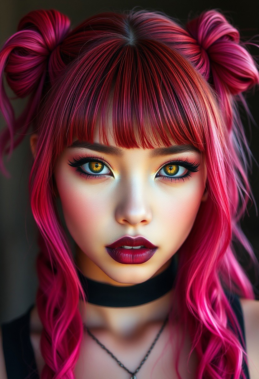 This is a highly detailed, portrait of a young pacific islander woman with an edgy,25yo, gothic aesthetic. She has long, wavy stong redand pink hair styled in high pigtails, with bangs framing her face. Her skin is pale with a slight glow, suggesting a youthful, She has striking, bold makeup with yellow, electric eyes, thick eyeliner, and deep black eyeshadow, complementing her dark lipstick.