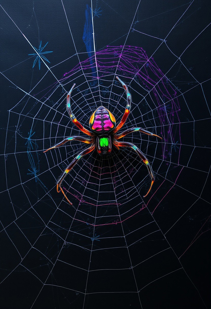 A hauntingly beautiful image of a dark, scratch art background, with a spider spinning its web, like a master of macabre manipulation. The spider, a vibrant, multicolored creature, seems to glow with an otherworldly light, its eyes gleaming with a malevolent intensity. The web, a intricate, swirling vortex of color, seems to pulse with a creepy, crawly energy, as if it's alive and waiting to snare its prey. The scratch art, a textured, layered effect, creates a sense of depth and dimensionality, as if the viewer is gazing into a dark, mystical realm. The dark, ink background provides a striking contrast to the vibrant, multicolored spider and web, creating a sense of drama and tension. The overall effect is one of eerie, Halloween magic, as if the viewer is witnessing a supernatural, arachnid spectacle. highest-Quality, intricate details, visually stunning, Masterpiece