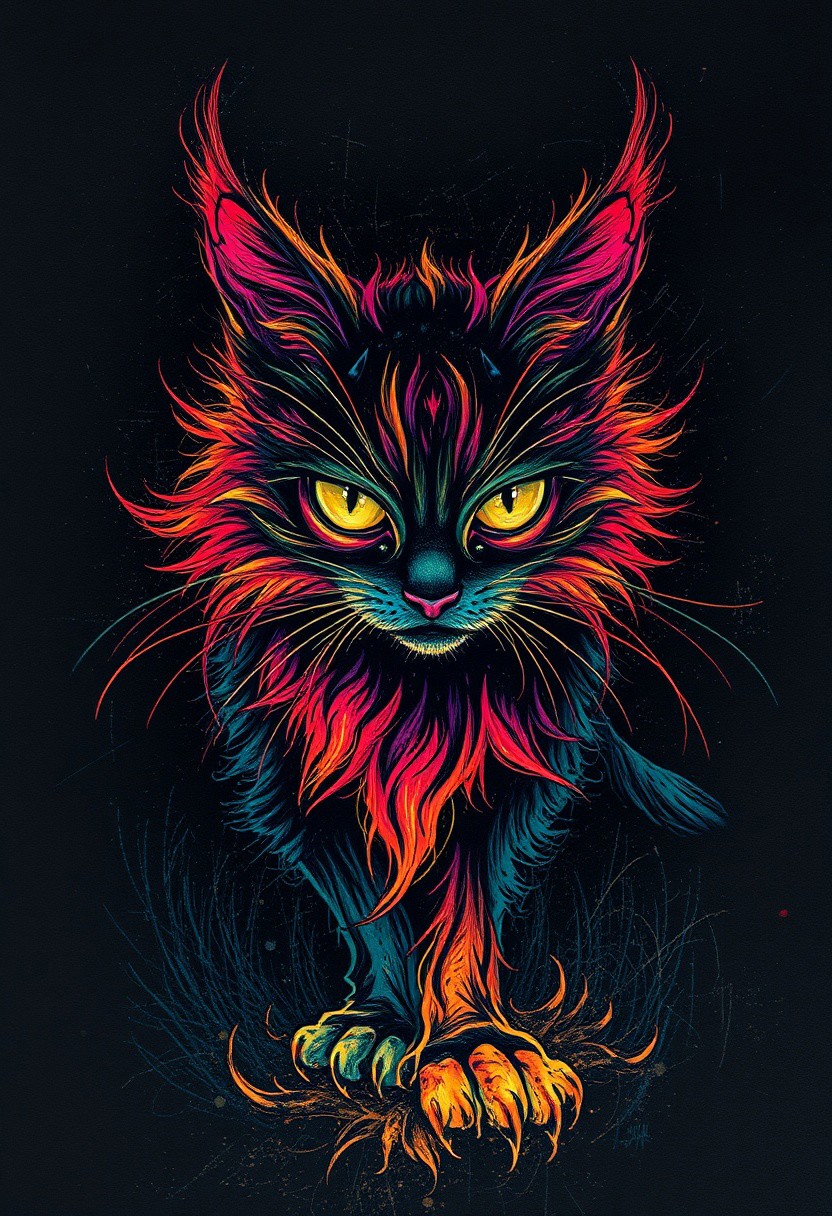 A hauntingly beautiful image of a dark, scratch art background, with a creepy cat emerging from the shadows, like a ghostly apparition. The cat, a vibrant, multicolored creature, seems to glow with an otherworldly light, its eyes gleaming with a malevolent intensity. The cat's fur, a swirling, vibrant texture, seems to pulse with a creepy, crawly energy, as if it's alive and waiting to pounce. The scratch art, a textured, layered effect, creates a sense of depth and dimensionality, as if the viewer is gazing into a dark, mystical realm. The dark, ink background provides a striking contrast to the vibrant, multicolored cat, creating a sense of drama and tension. The overall effect is one of eerie, Halloween magic, as if the viewer is witnessing a supernatural, feline spectacle. highest-Quality, intricate details, visually stunning, Masterpiece