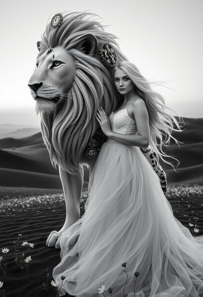 (Soft Lighting Photography by Mimoza Veliu and Mario Giacomelli:1.2), NSFW, (Soft Lighting Photography by Mimoza Veliu and Mario Giacomelli:1.2), NSFW, A beautiful woman with flowing silver hair and piercing violet eyes stands gracefully beside her companion, a majestic lion crafted from a mesmerizing interplay of black and white clockwork. The lion, a marvel of contrasting mechanical artistry, stands tall and proud, its mane a cascade of alternating black and white gears and intricate cogs, its body radiating a soft, ethereal glow. The woman, radiating grace and elegance, wears a flowing gown of swirling black and white that blends seamlessly with the ethereal landscape. The scene is set against a backdrop of a timeless realm where magic and technology intertwine, bathed in the soft glow of a twilight where black and white blend seamlessly. Rolling hills of black sand stretch out towards a horizon veiled in a soft, white mist. Black and white flowers bloom at their feet, their petals shimmering with a gentle luminescence. This image captures the ethereal beauty and harmonious unity of contrasting forces, a testament to the enduring power of companionship and the enchanting mystery of their shared guardianship over a realm of balance and duality. , sexy