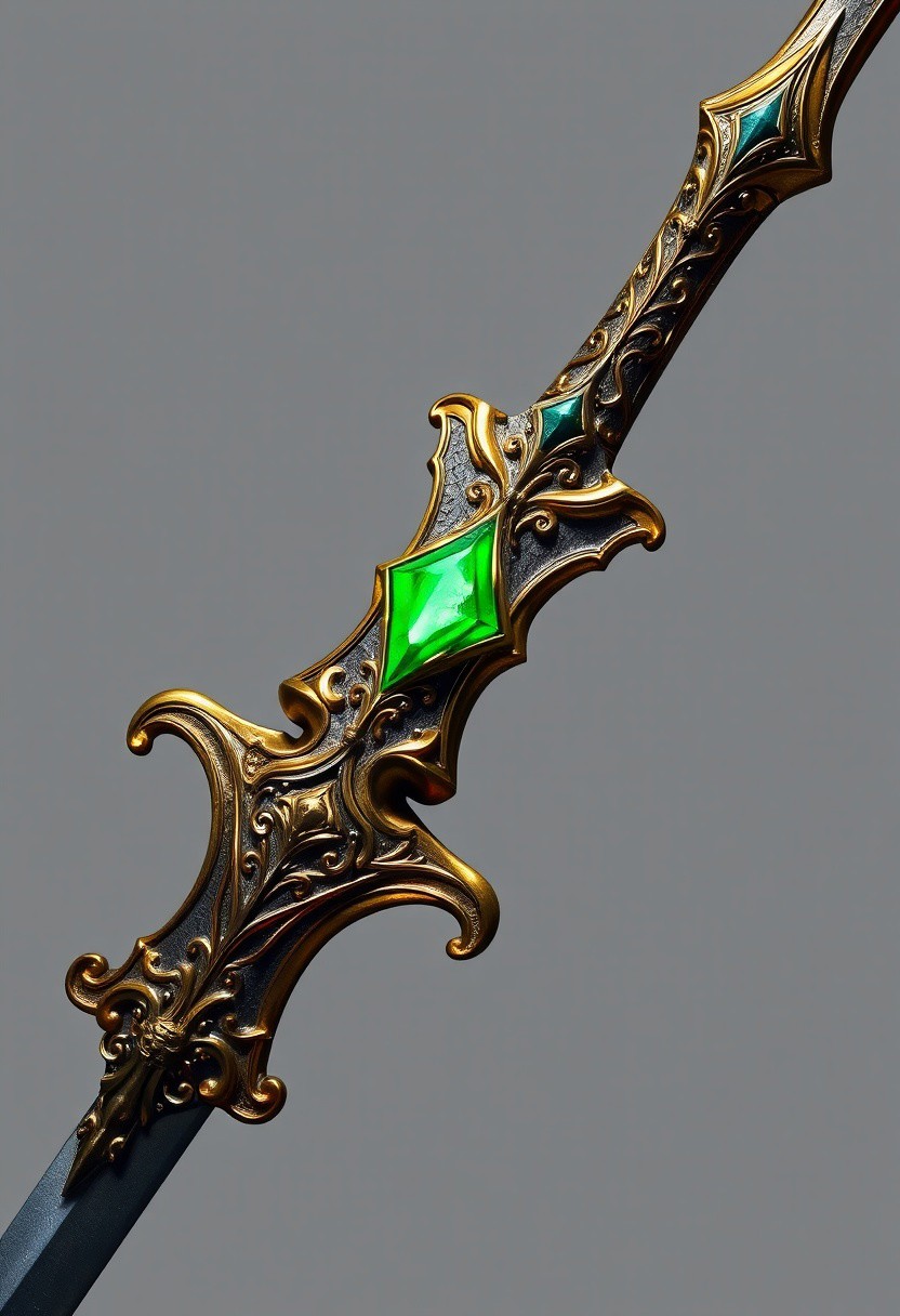 A Highly Detailed Ancient Looking gold Sword With A Single Light green Gem embedded in the hilt