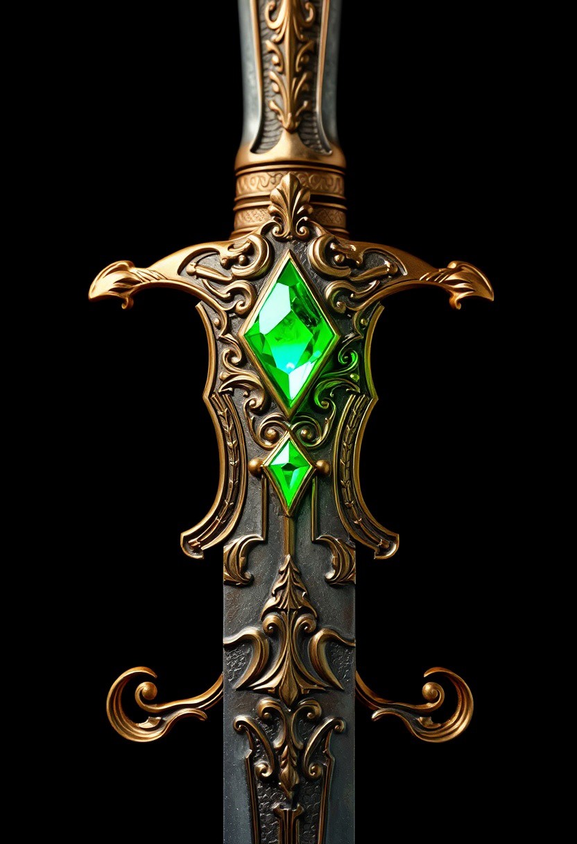 A Highly Detailed Ancient Looking gold Sword With A Single Light green Gem embedded in the hilt