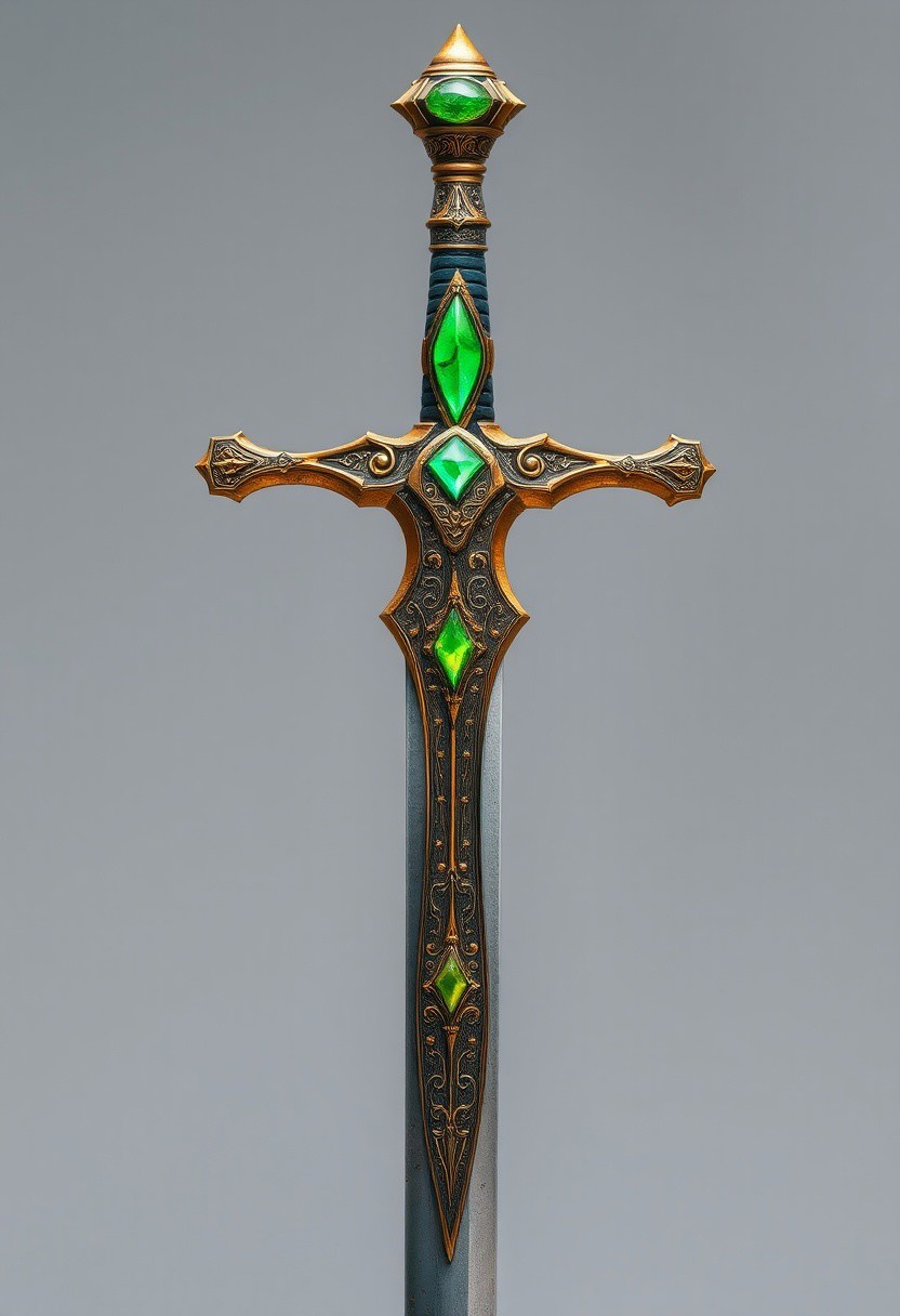 A Highly Detailed Ancient Looking gold Sword With A Single Light green Gem embedded in the hilt