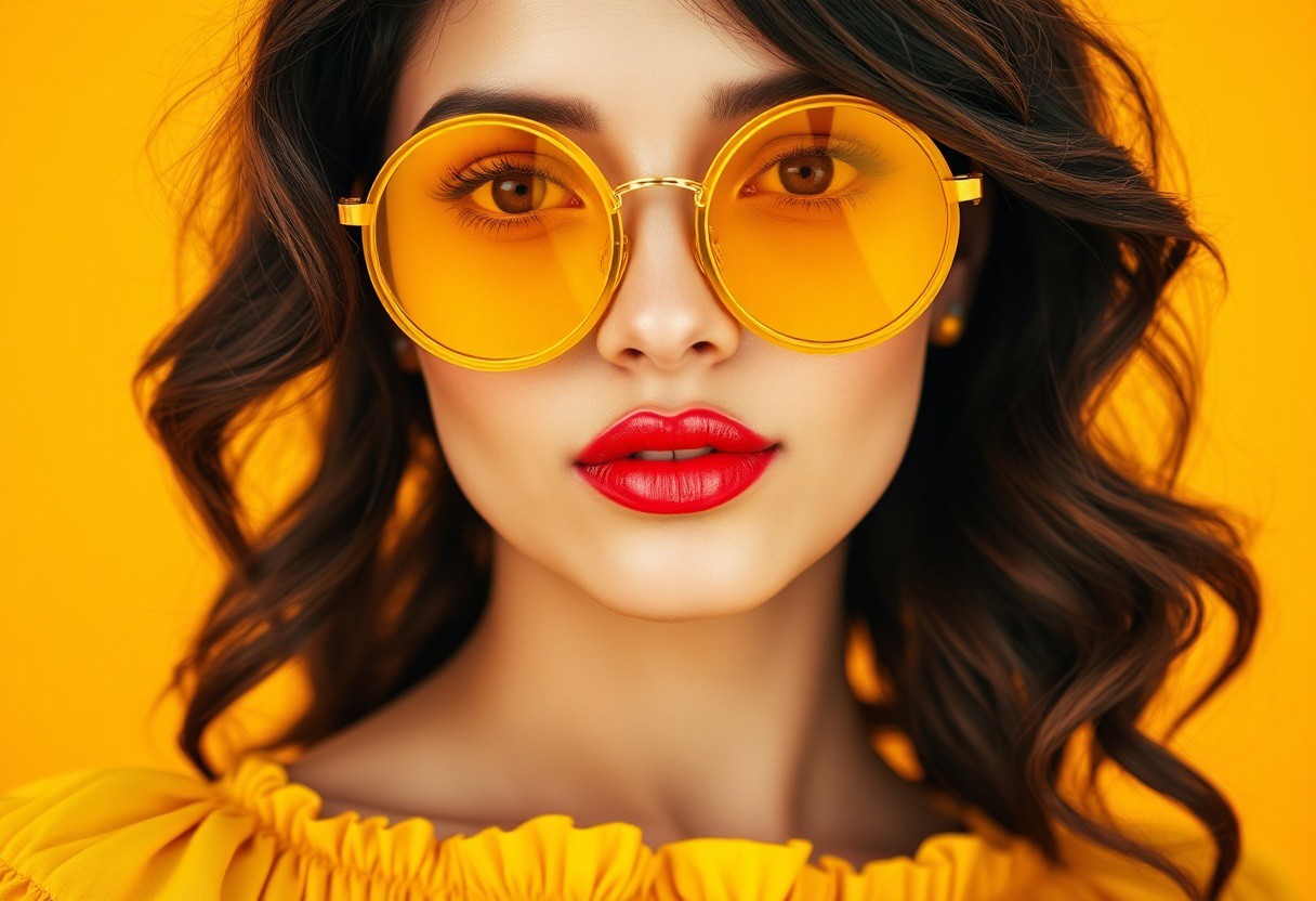 Close-up of a woman with dark brown, wavy hair and round, yellow sunglasses. The woman is positioned against a solid yellow background. Her face and upper torso are the central focus. Her skin appears smooth and light-toned. She has a soft, slightly lifted expression, and her lips are painted with a vibrant, coral-toned lipstick. Her eyes are visible beneath the sunglasses. The sunglasses are round and yellow, with gold-toned rims and a noticeable frame. The woman is wearing a loose, yellow, off-the-shoulder top with a ruffled or pleated design. The fabric looks like a type of soft, flowing silk or chiffon. The fabric texture is visible; the pleats and folds are apparent. The lighting highlights the woman's features and creates a warm, slightly soft glow. The yellow background contrasts sharply with her skin and clothing, emphasizing her appearance. The image's overall aesthetic is fashion-oriented, possibly for a magazine or social media. <lora:FLUX-daubrez-DB4RZ-v2:1> DB4RZ, DB4RZ style painting