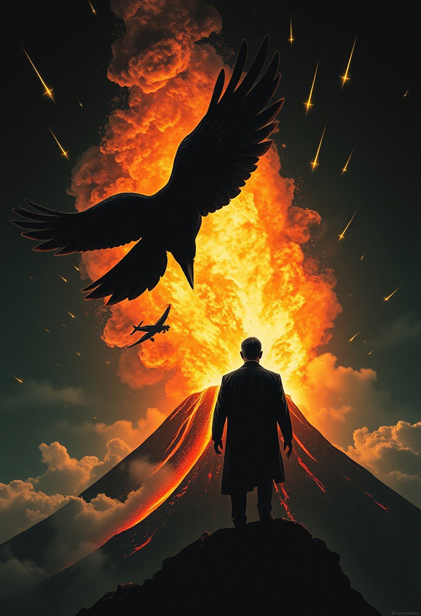 vintage movie poster with black SKY very clean colours, meteors falling from sky, and a black raven flying with wings like thunders coming out from a volcano erupting ,wind seems like flames, behind a very clear silhouette of man from mexico looking to the raven in sky, a plane hit by a storm flying in the distance. extremely intricate, stylized and classy concept art, a professional photograph. Detailed Textures, high quality, high resolution, high Accuracy, realism, color correction, Proper lighting settings, experimental art composition Text "Rey Trueno",